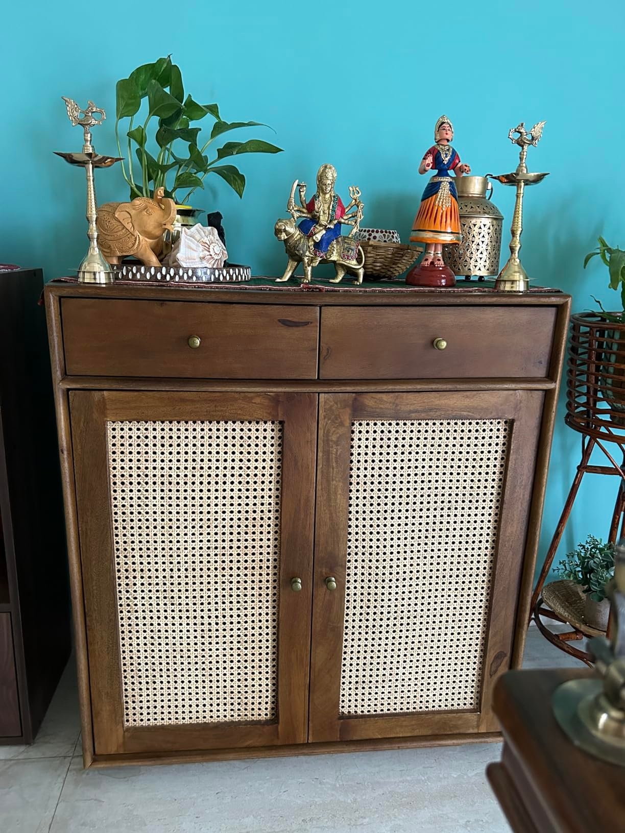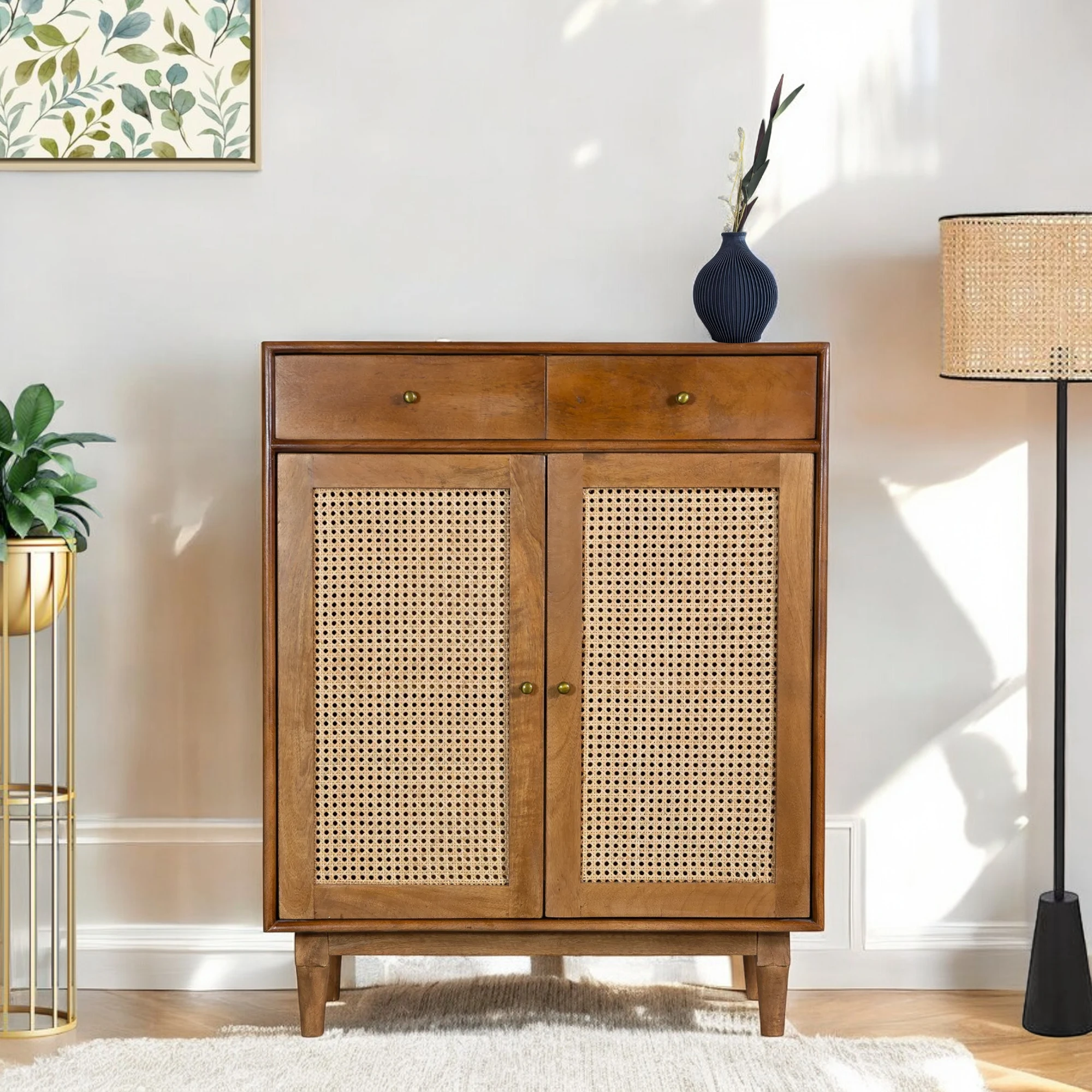 Introducing the Atalanta Sideboard, a symbol of natural beauty and functional elegance. Crafted from the finest mango wood, this sideboard is a testament to the artistry of woodworking. Its warm and inviting light brown finish enhances the wood’s natural grain, creating a piece that’s both visually pleasing and practical. The Atalanta Sideboard features two exquisite cane doors, adding a touch of rustic charm to its design. These doors allow for discreet storage while showcasing the delicate craftsmanship of the cane weave. Additionally, two drawers offer convenient space for organizing your belongings, making it a versatile storage solution for any room in your home. With its understated yet sophisticated appearance, the Atalanta Sideboard effortlessly complements various interior styles, from classic to contemporary. Elevate your living space with this piece of functional artistry, where timeless design meets the warmth of mango wood and the allure of cane, making it a true focal point in your home.