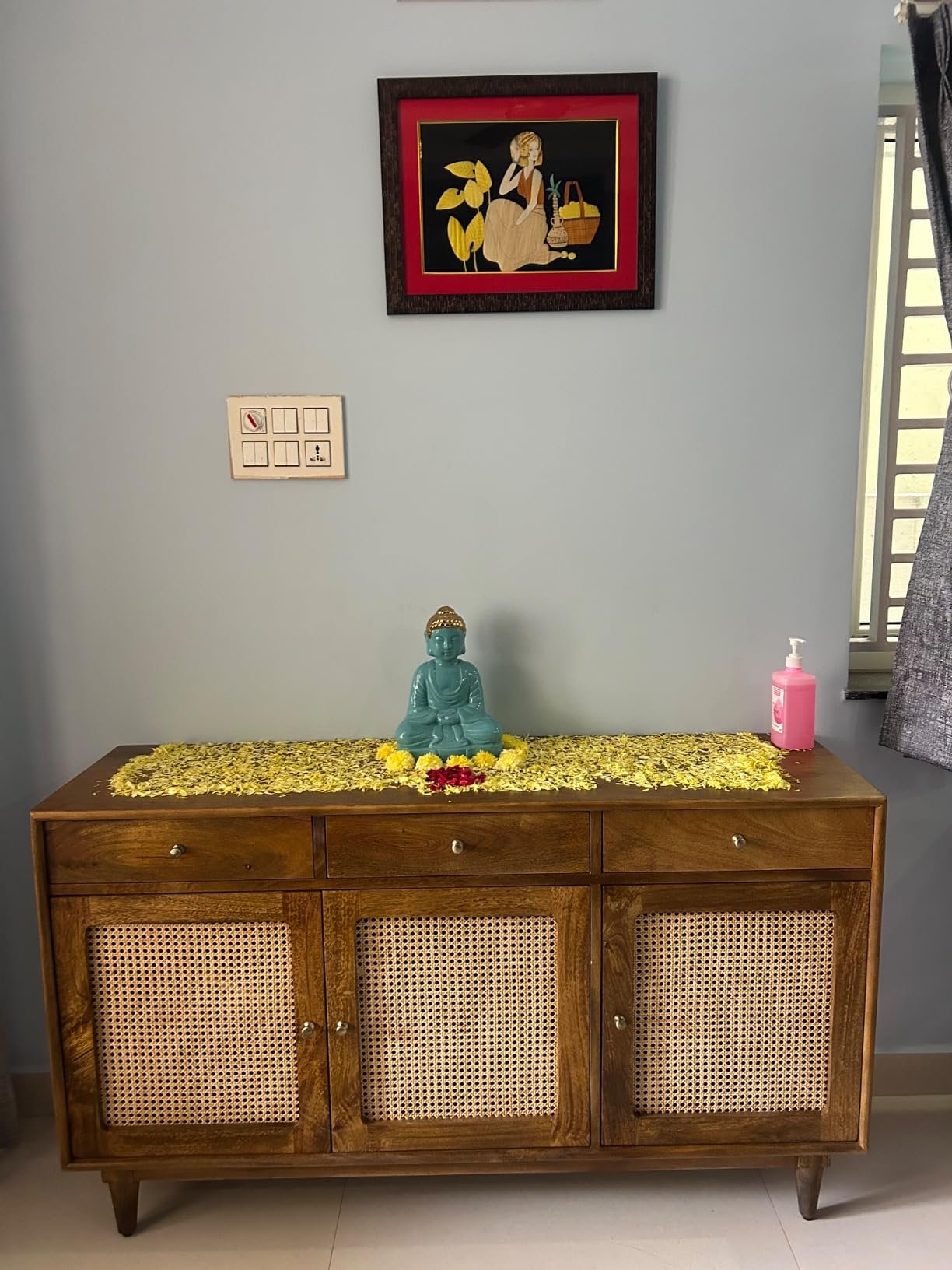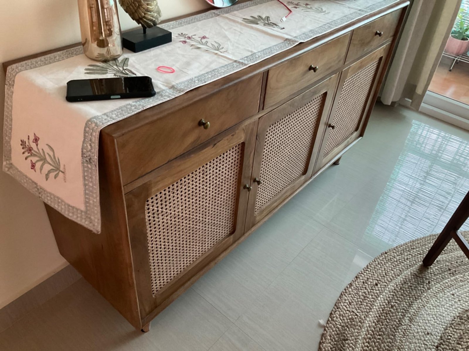 The atalanta sideboard is a versatile and stylish piece of furniture that combines modern design with classic craftsmanship. It features three spacious drawers and three cane / rattan doors that offer ample storage space for your essentials. The sideboard is finished in a warm brown colour that complements any decor. The atalanta sideboard is ideal for your living room, dining room, or hallway, as it adds a touch of elegance and charm to your space. Whether you use it to display your favourite items, store your books and magazines, or organize your tableware, the atalanta sideboard will enhance your home with its beauty and functionality