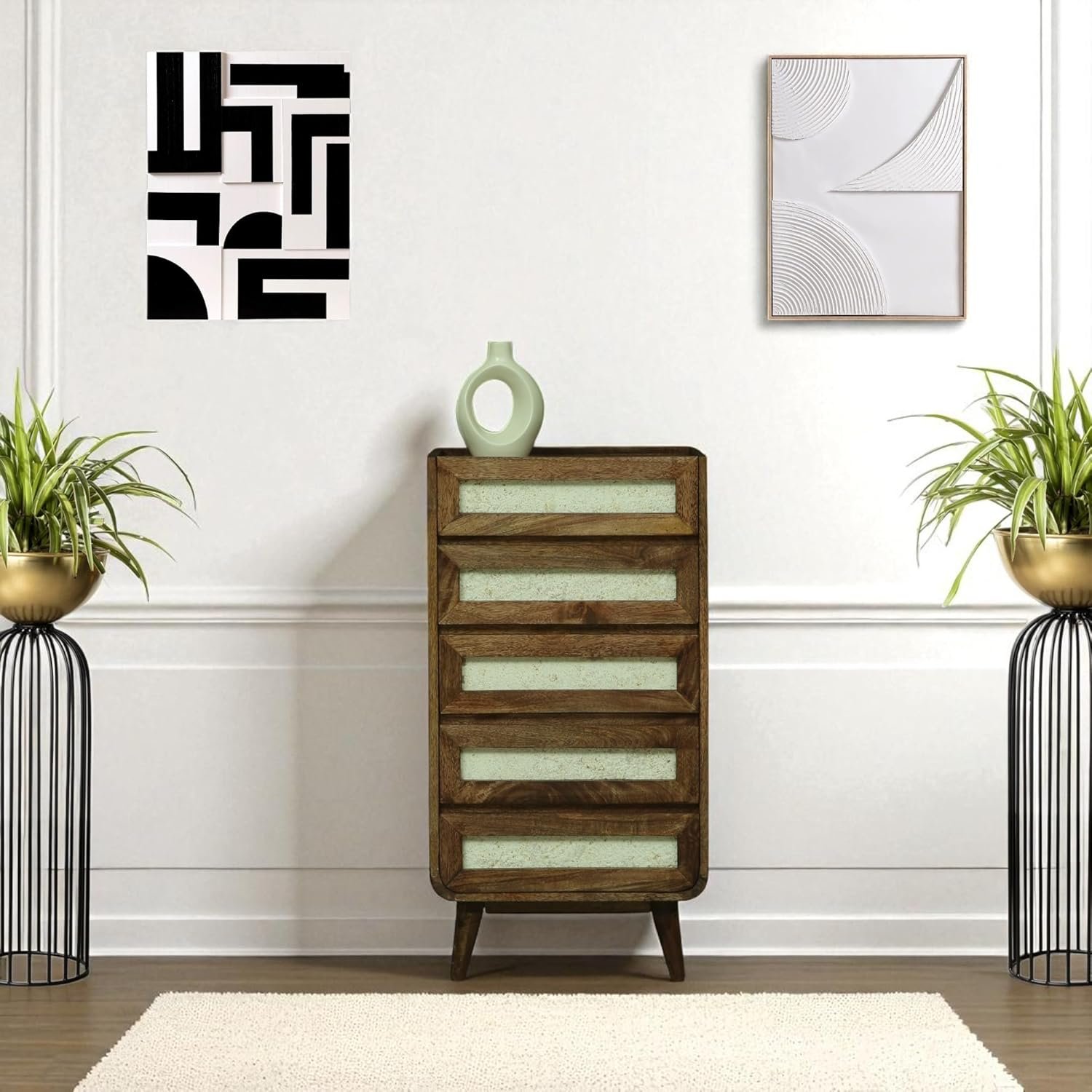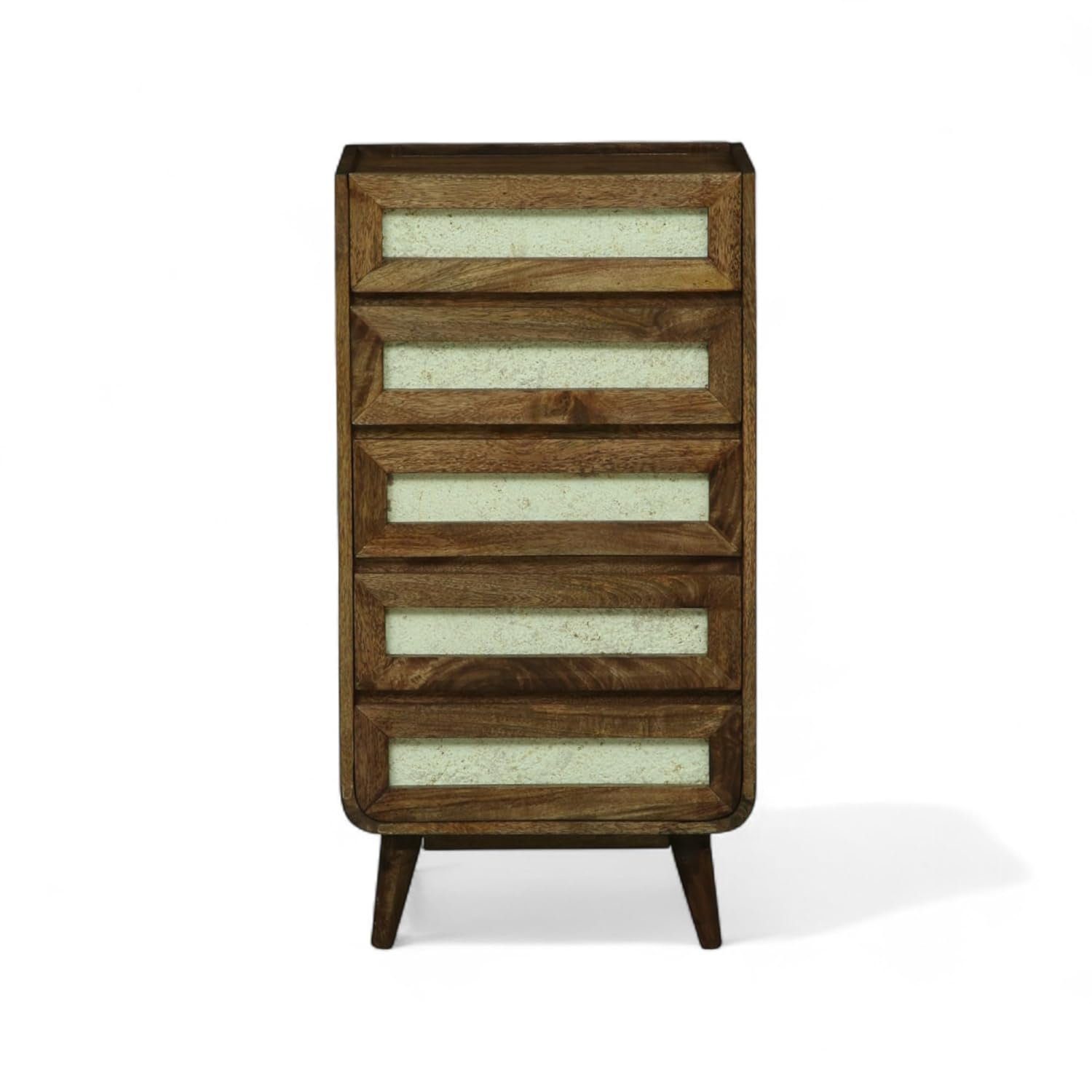 Add charm and functionality to your space with the Kraft Bazaar Solid Wood Concerto Chest of Drawers, beautifully crafted from premium Mango wood. Known for its strength and beautiful grain patterns, Mango wood offers both durability and natural elegance.This chest features 5 spacious drawers, ideal for organizing clothes, accessories, and everyday essentials. The rich walnut brown finish enhances the texture of the wood, creating a warm and stylish look that fits into any modern or classic interior. Perfect for bedrooms, hallways, or living rooms, this piece combines practical storage with timeless design.
