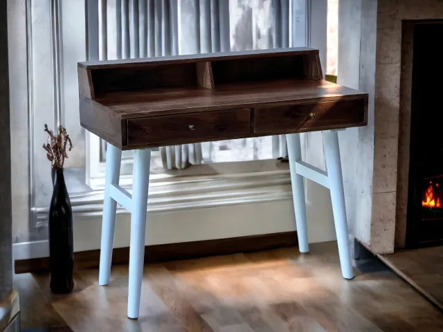 Introducing the perfect study companion, our stylish and functional study table made from high-quality mango wood. With two spacious drawers and one shelf, this table provides ample storage space for all your books, stationery, and other study essentials. The table’s sleek design and brown and white finish add a touch of elegance to any room, making it an excellent addition to your home office or study space. The smooth surface of the table provides a comfortable workspace, allowing you to focus on your work without any distractions. Crafted from sturdy and durable mango wood, this study table is built to last. The wood’s natural grain pattern and unique texture give each piece a distinct character, making it a one-of-a-kind piece for your home. The two drawers provide easy access to your belongings while the open shelf allows you to display your favorite books or decorative items. The table’s compact size makes it perfect for small spaces, while its ample storage space ensures that you have everything you need within reach. Whether you’re studying, working, or simply need a space to organize your belongings, our study table with two drawers and one shelf is the perfect addition to your home. With its sleek design, high-quality materials, and ample storage space, this table is sure to enhance your study experience.