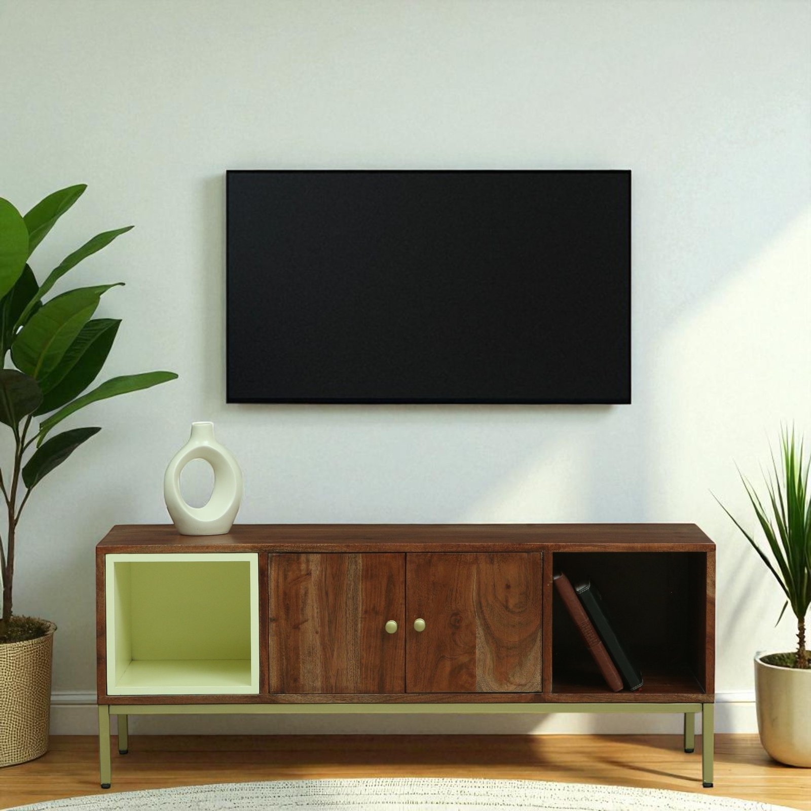 Kalki Solid Acacia Wood TV Console , Finish – Tubaq & Off White