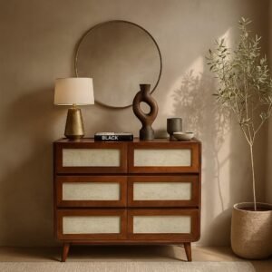 Introducing the Luffy Chest of Drawers – a harmonious fusion of elegance and functionality. This exquisite piece features six thoughtfully designed drawers, providing ample storage space to keep your belongings organized and easily accessible. Crafted with precision, two of the drawers boast intricate carvings, adding a touch of artistry to this exceptional piece. The remaining four drawers showcase the natural beauty of cane, offering a unique texture and a warm, inviting aesthetic. The Luffy Chest of Drawers is finished in a soothing light brown hue, evoking a sense of tranquility and blending seamlessly with various interior styles. The addition of Tubaq further enhances its durability, ensuring that this chest of drawers will stand the test of time. Elevate your living space with the Luffy Chest of Drawers – a testament to both craftsmanship and style, designed to be cherished for generations to come.