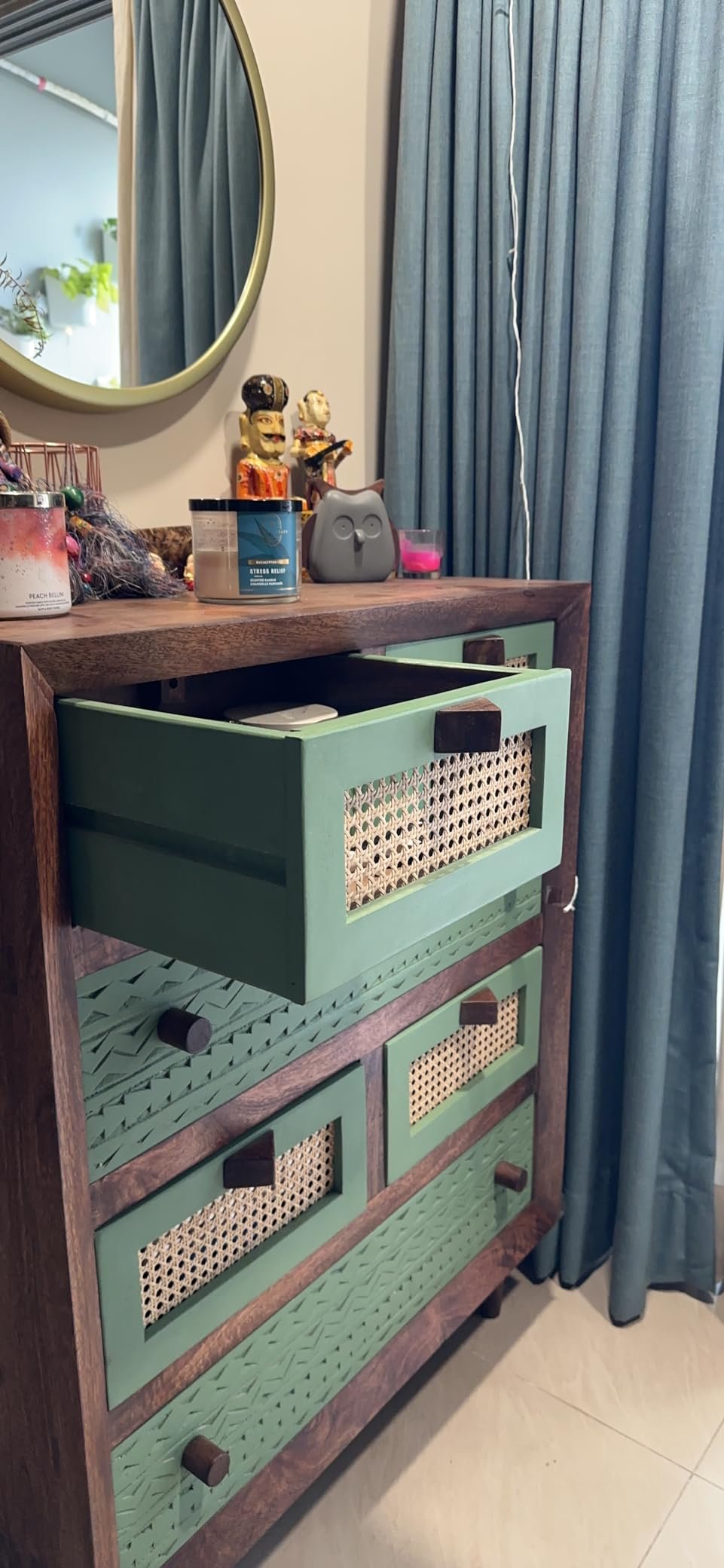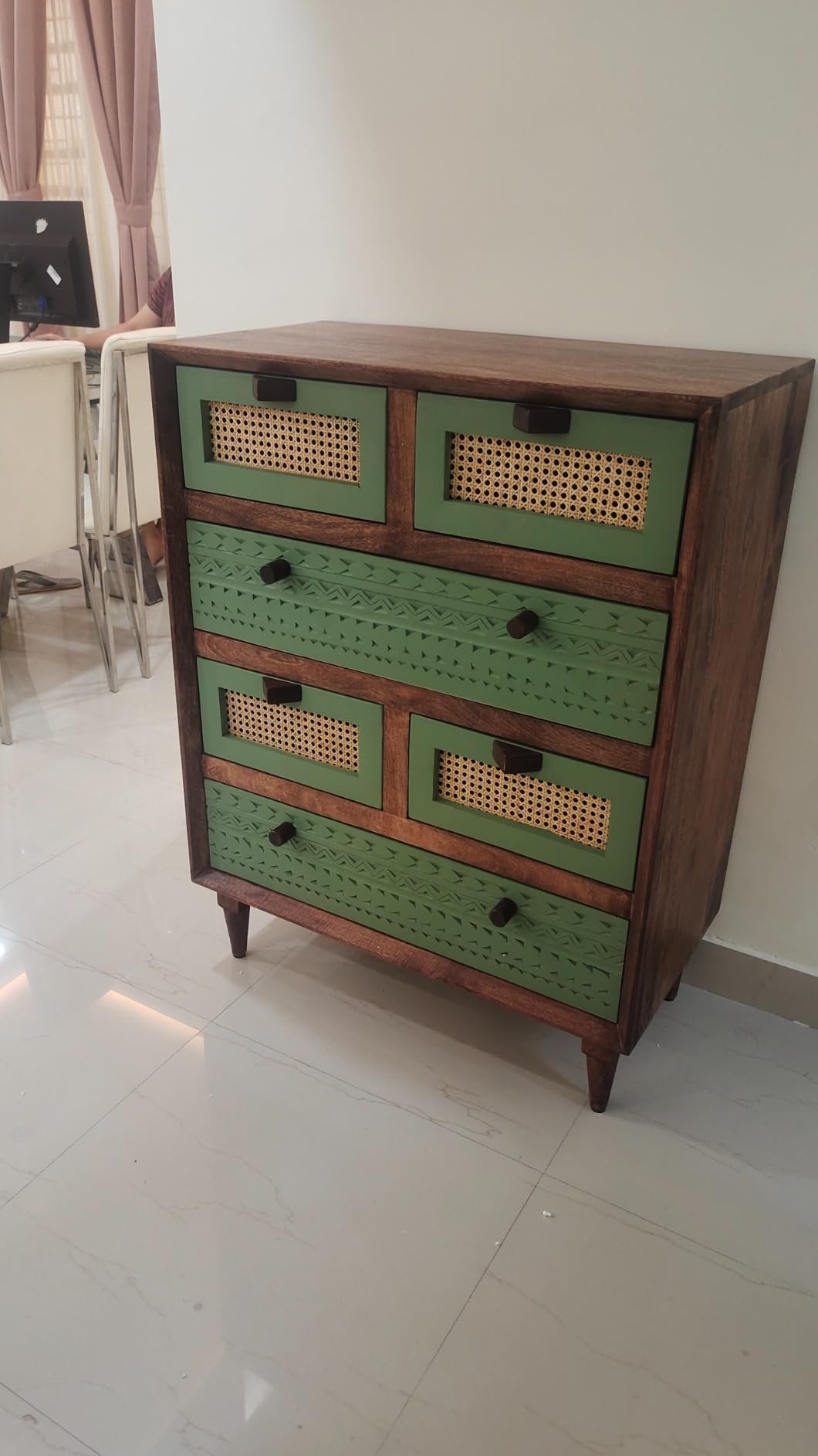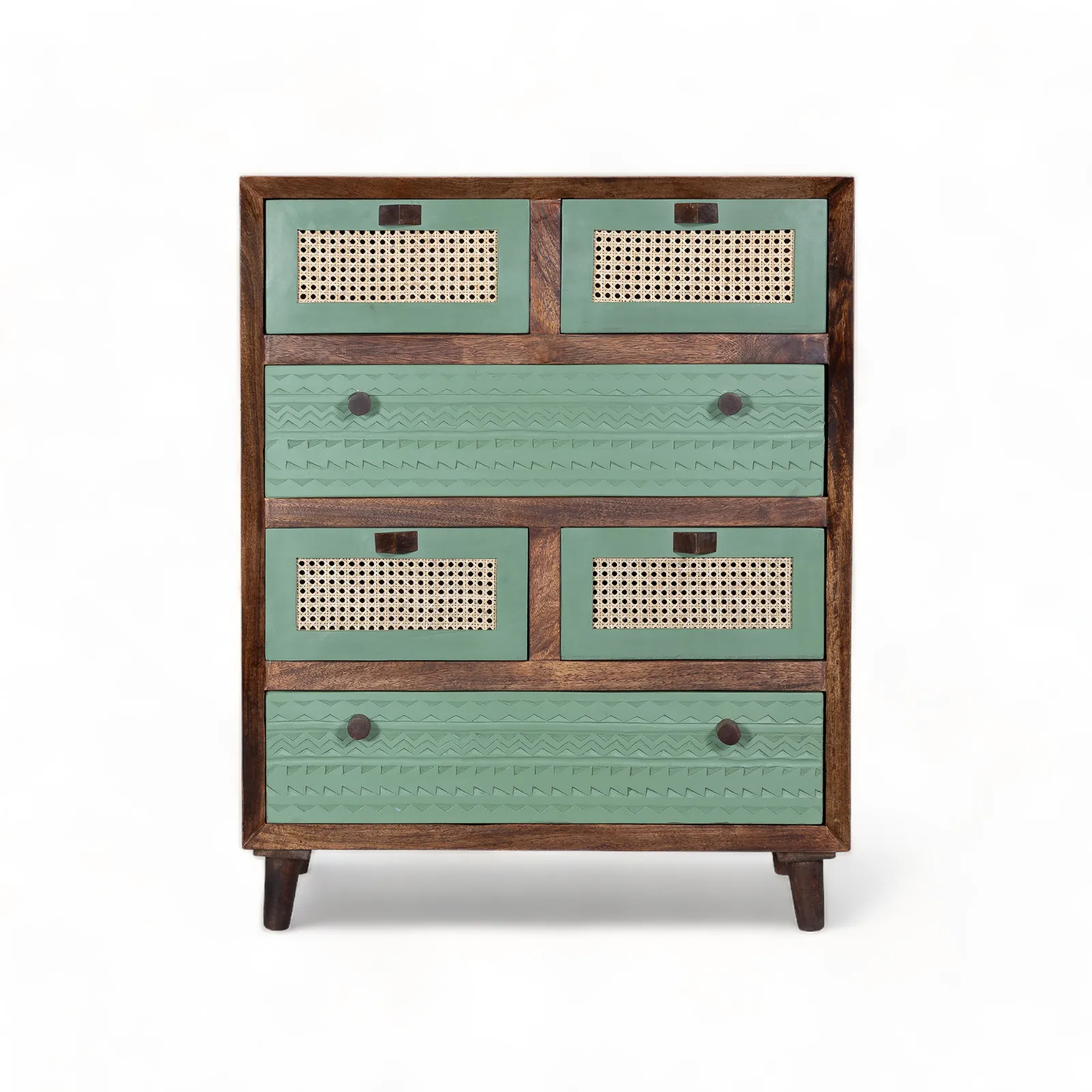 Introducing the Luffy Chest of Drawers: a fusion of elegance and functionality that will elevate your living space to new heights. With six meticulously crafted drawers, this exquisite piece seamlessly combines form with purpose. The Luffy Chest of Drawers boasts a unique design, featuring two drawers adorned with intricate carvings, adding an artistic touch to your interior decor. These carved drawers serve as a focal point, showcasing the artisanal craftsmanship that sets this piece apart. To complement the intricate carvings, four additional drawers feature a natural cane finish, providing a subtle yet striking contrast that adds depth and texture to the overall aesthetic. The combination of carving and cane creates a harmonious blend of traditional and contemporary elements, making this chest of drawers a versatile addition to any room. Finished in a premium Olive green hue, the Luffy Chest of Drawers exudes sophistication and opulence. The rich, earthy tones bring a touch of nature indoors, creating a warm and inviting atmosphere. Additionally, the Tubaq finish adds a protective layer, ensuring the longevity and durability of this exceptional piece. With ample storage space, the Luffy Chest of Drawers offers practicality without compromising on style. Organize your belongings effortlessly, while enjoying the visual allure of this finely crafted piece. Whether in the bedroom, living room, or any space in need of a statement piece, the Luffy Chest of Drawers is a testament to exquisite design and exceptional quality. Elevate your living experience with this one-of-a-kind masterpiece, designed to inspire admiration and envy alike.