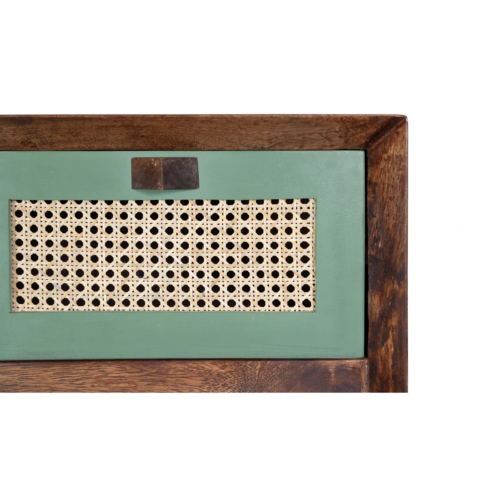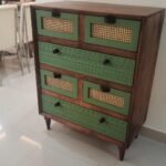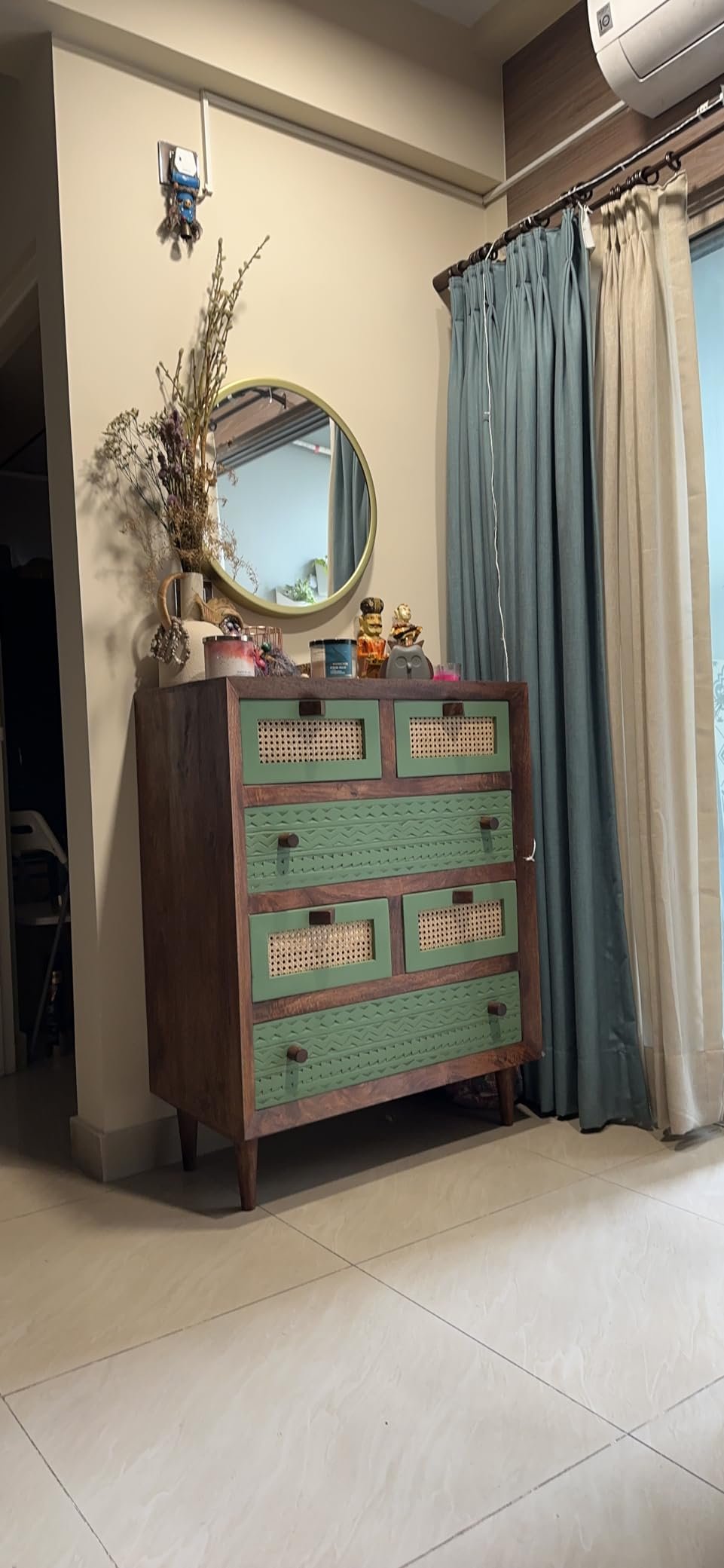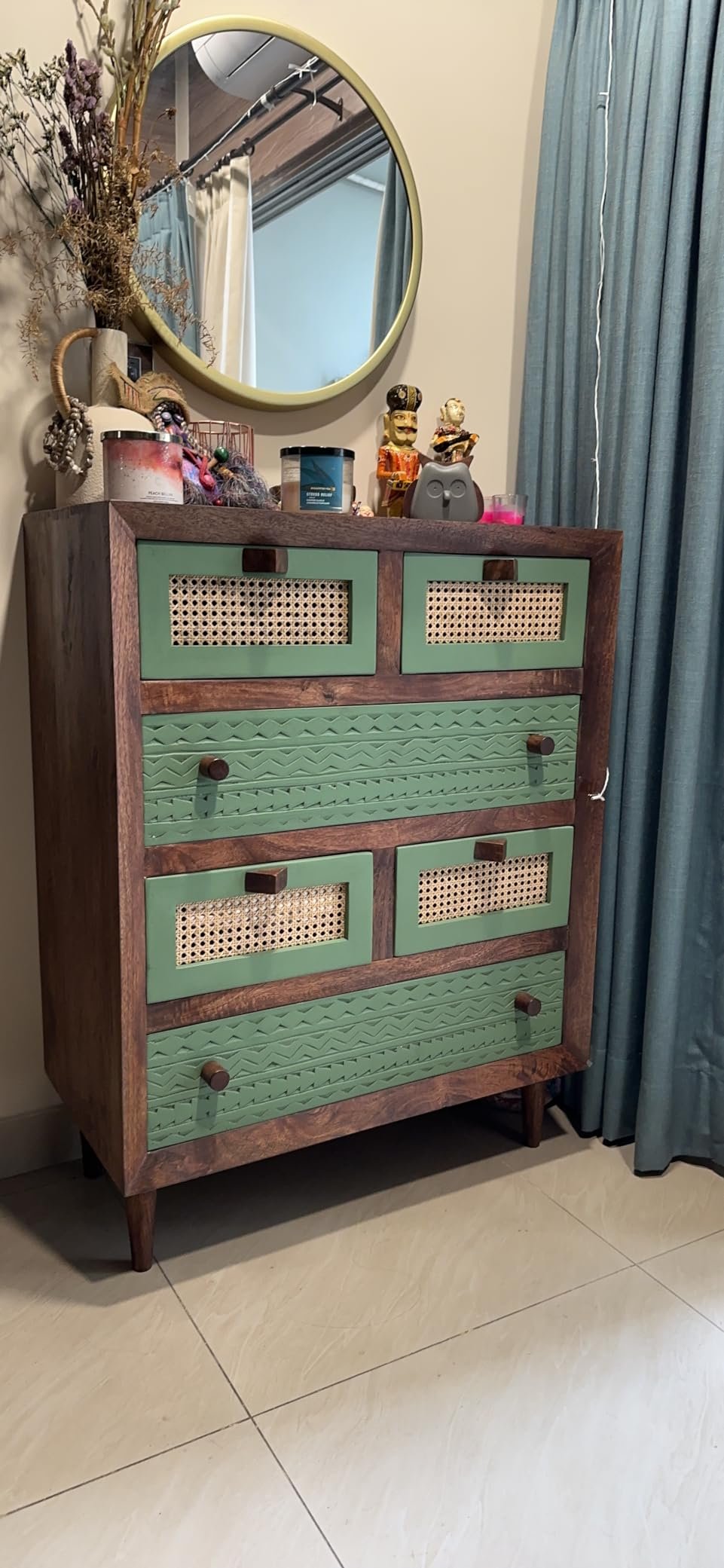 Introducing the Luffy Chest of Drawers: a fusion of elegance and functionality that will elevate your living space to new heights. With six meticulously crafted drawers, this exquisite piece seamlessly combines form with purpose. The Luffy Chest of Drawers boasts a unique design, featuring two drawers adorned with intricate carvings, adding an artistic touch to your interior decor. These carved drawers serve as a focal point, showcasing the artisanal craftsmanship that sets this piece apart. To complement the intricate carvings, four additional drawers feature a natural cane finish, providing a subtle yet striking contrast that adds depth and texture to the overall aesthetic. The combination of carving and cane creates a harmonious blend of traditional and contemporary elements, making this chest of drawers a versatile addition to any room. Finished in a premium Olive green hue, the Luffy Chest of Drawers exudes sophistication and opulence. The rich, earthy tones bring a touch of nature indoors, creating a warm and inviting atmosphere. Additionally, the Tubaq finish adds a protective layer, ensuring the longevity and durability of this exceptional piece. With ample storage space, the Luffy Chest of Drawers offers practicality without compromising on style. Organize your belongings effortlessly, while enjoying the visual allure of this finely crafted piece. Whether in the bedroom, living room, or any space in need of a statement piece, the Luffy Chest of Drawers is a testament to exquisite design and exceptional quality. Elevate your living experience with this one-of-a-kind masterpiece, designed to inspire admiration and envy alike.