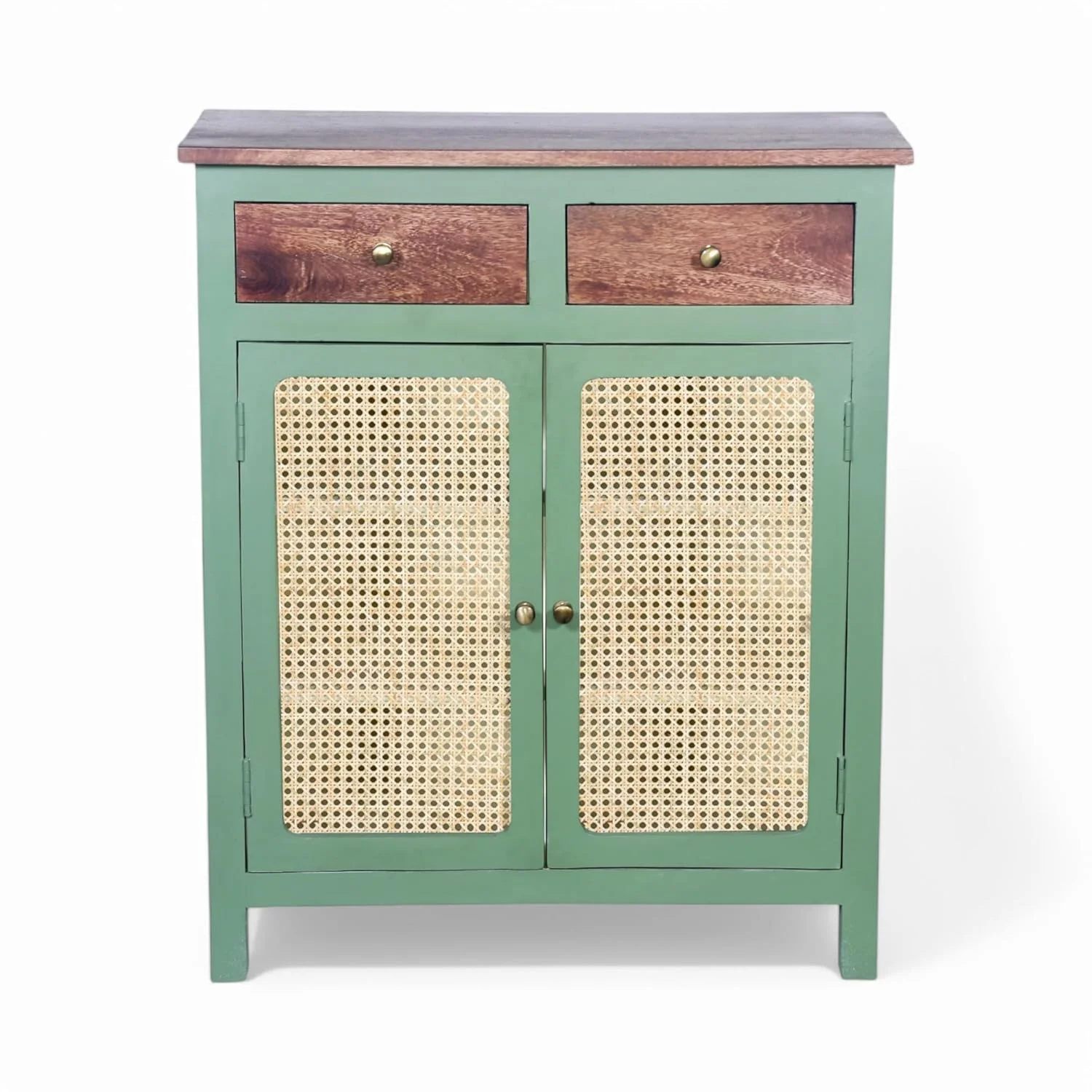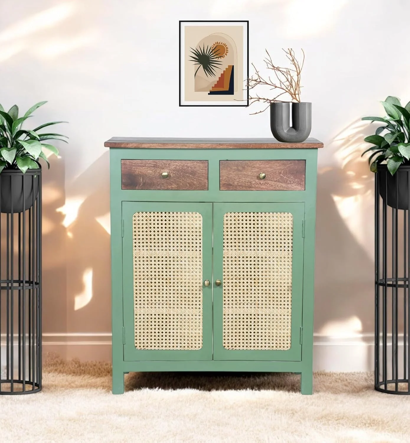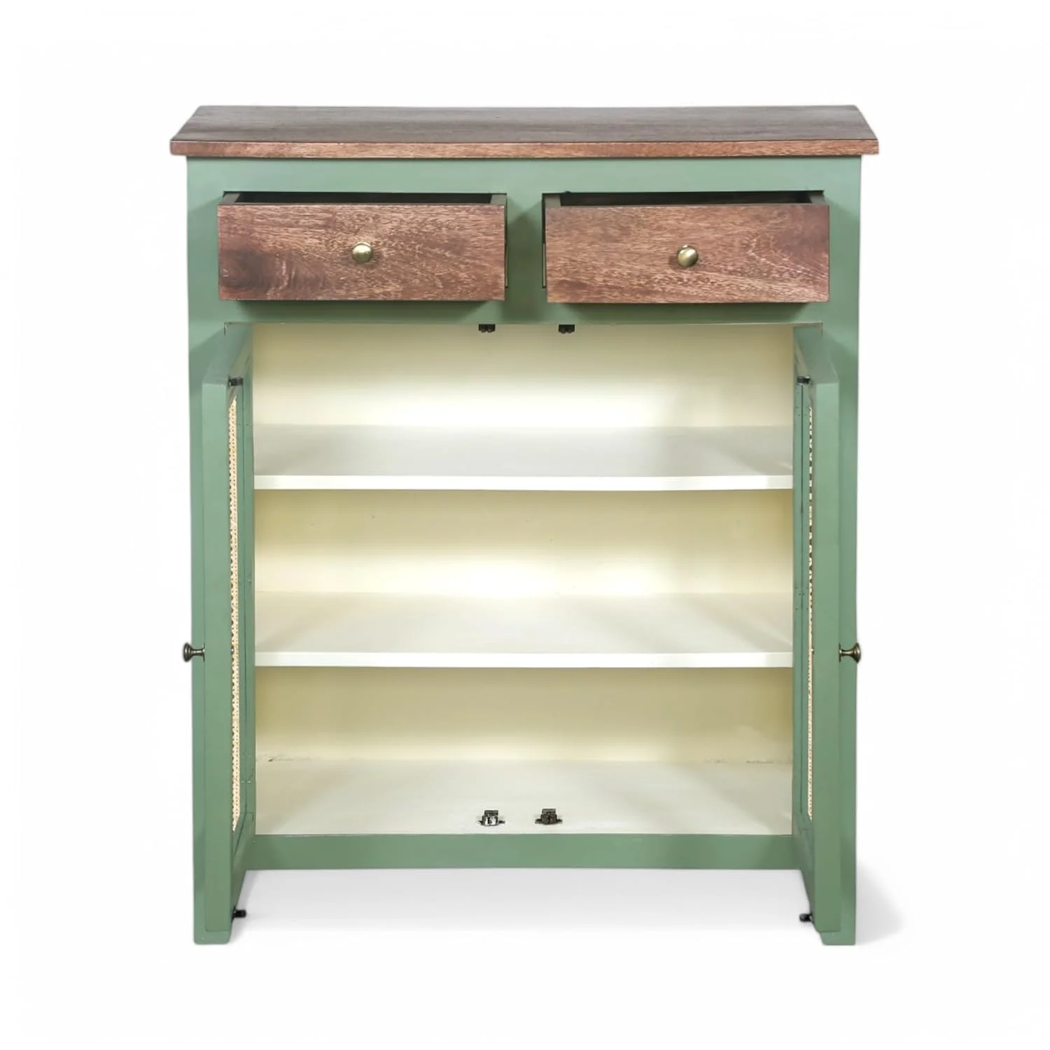 Madrid Two-Drawer Crockery Cabinet – Solid Mango Wood with Rattan Doors Elevate your home décor with the Madrid Two-Drawer Crockery Cabinet, a perfect blend of elegance, durability, and functionality. Crafted from premium solid mango wood, this cabinet boasts a luxurious olive green and off-white finish, enhanced with a scratch-resistant Tubaq coating for long-lasting beauty. Designed for both storage and style, the cabinet features handwoven rattan doors, adding a natural and timeless charm to your space. Behind the doors, you’ll find three spacious shelves, providing ample storage for crockery, glassware, or decorative pieces. The two deep drawers offer additional space for cutlery, table linens, and other dining essentials. Perfect for dining rooms, kitchens, or living spaces, this handcrafted piece effortlessly combines modern aesthetics with traditional craftsmanship, making it a must-have for any home.