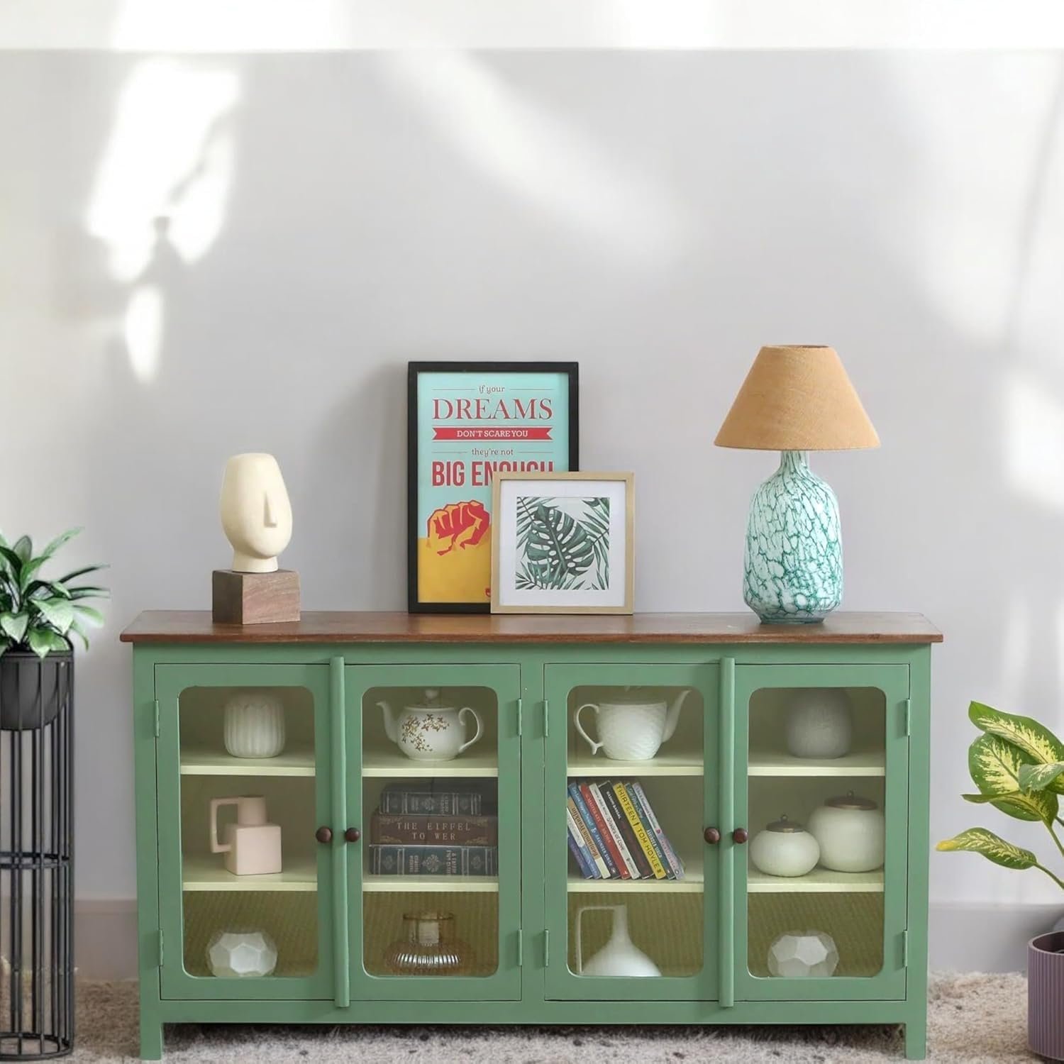 Madrid 4-Door Glass Sideboard Cabinet , Finish – Olive Green and Off White