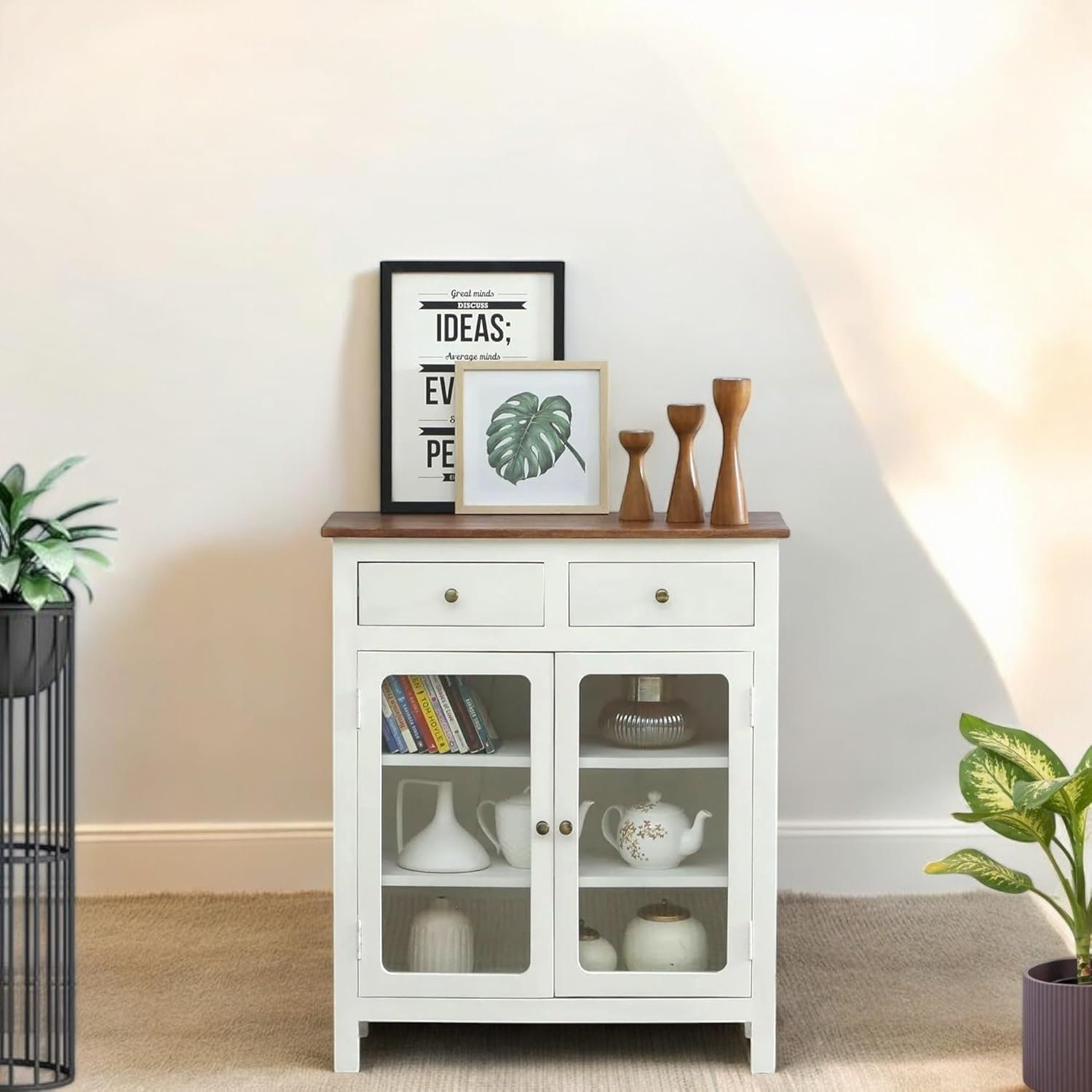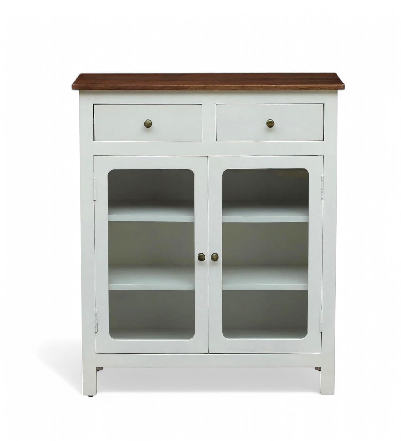 Madrid Two-Drawer Crockery Cabinet – Solid Mango Wood with Glass Doors Elevate your home décor with the Madrid Two-Drawer Crockery Cabinet, a perfect blend of elegance, durability, and functionality. Crafted from premium solid mango wood, this cabinet boasts a luxurious decu white finish, enhanced with a scratch-resistant Tubaq coating for long-lasting beauty. Designed for both storage and style, the cabinet features glass doors, adding a sleek and timeless charm to your space. Behind the doors, you’ll find three spacious shelves, providing ample storage for crockery, glassware, or decorative pieces. The two deep drawers offer additional space for cutlery, table linens, and other dining essentials. Perfect for dining rooms, kitchens, or living spaces, this handcrafted piece effortlessly combines modern aesthetics with traditional craftsmanship, making it a must-have for any home.
