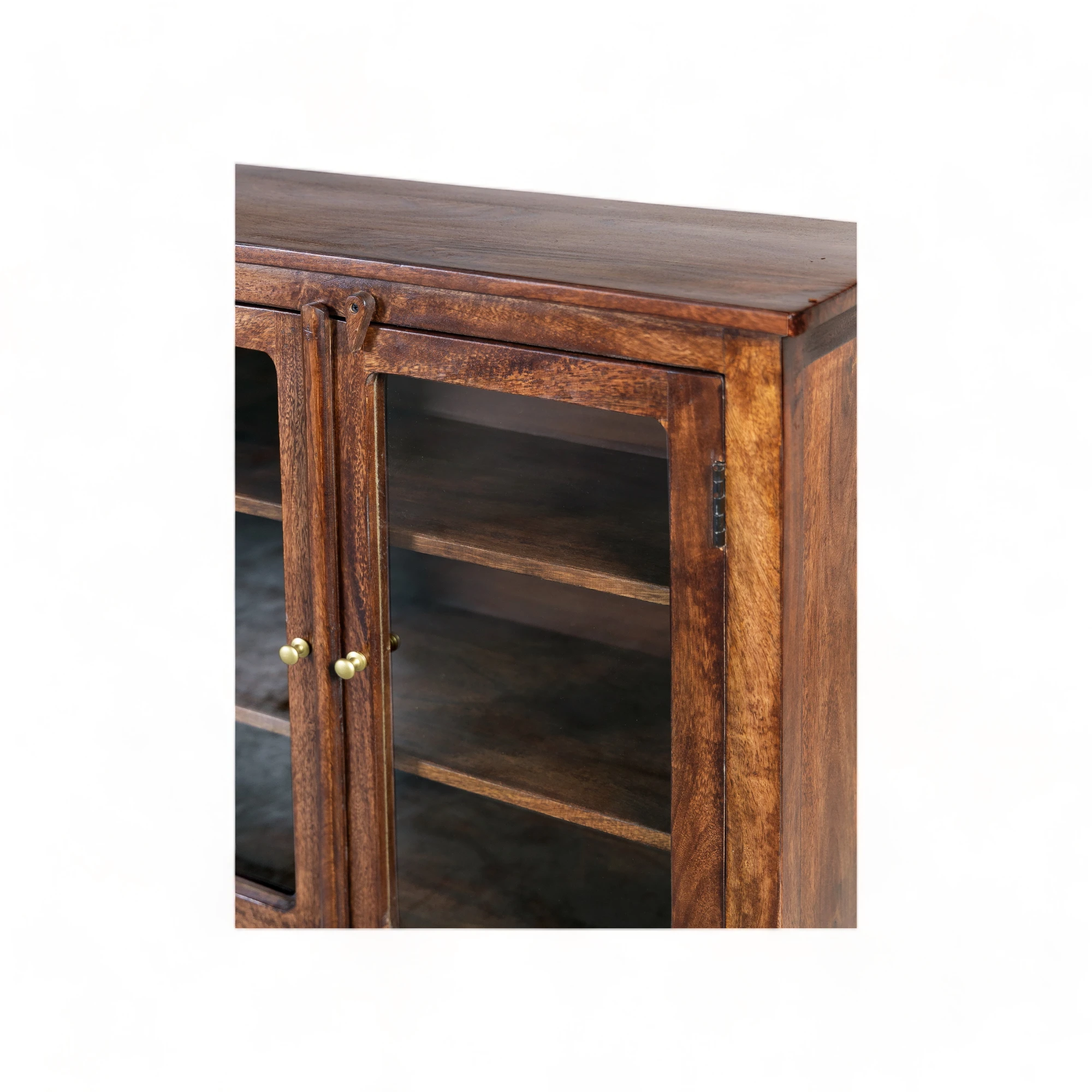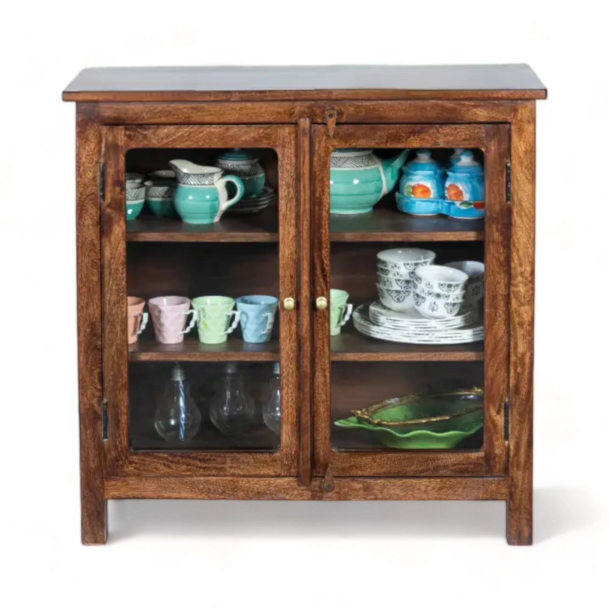 The glass doors add a touch of sophistication, allowing you to showcase your favorite dinnerware and add a pop of personality to your culinary haven. The natural grain of the mango wood gives each cabinet a unique character, making it a conversation starter and a feast for the eyes.
