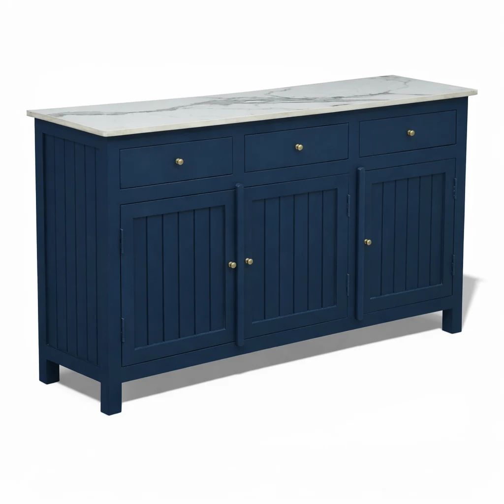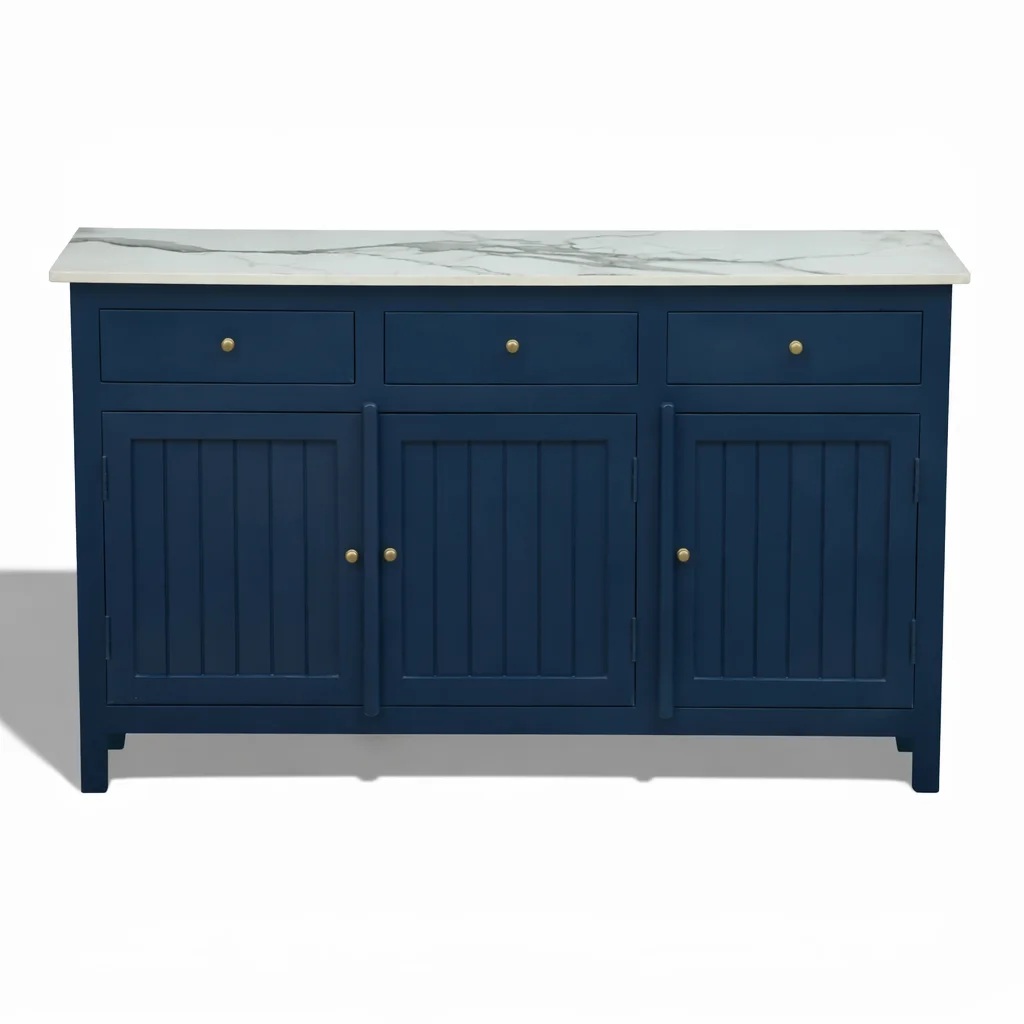 Enhance your living space with this elegant Midnight Blue sideboard cabinet designed to combine style and functionality. The cabinet features a premium sintered stone top inspired by Calacatta marble, offering excellent durability, heat resistance, and a luxurious look.