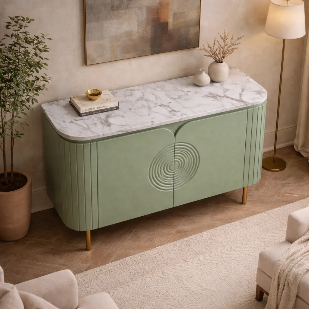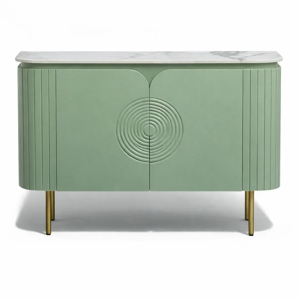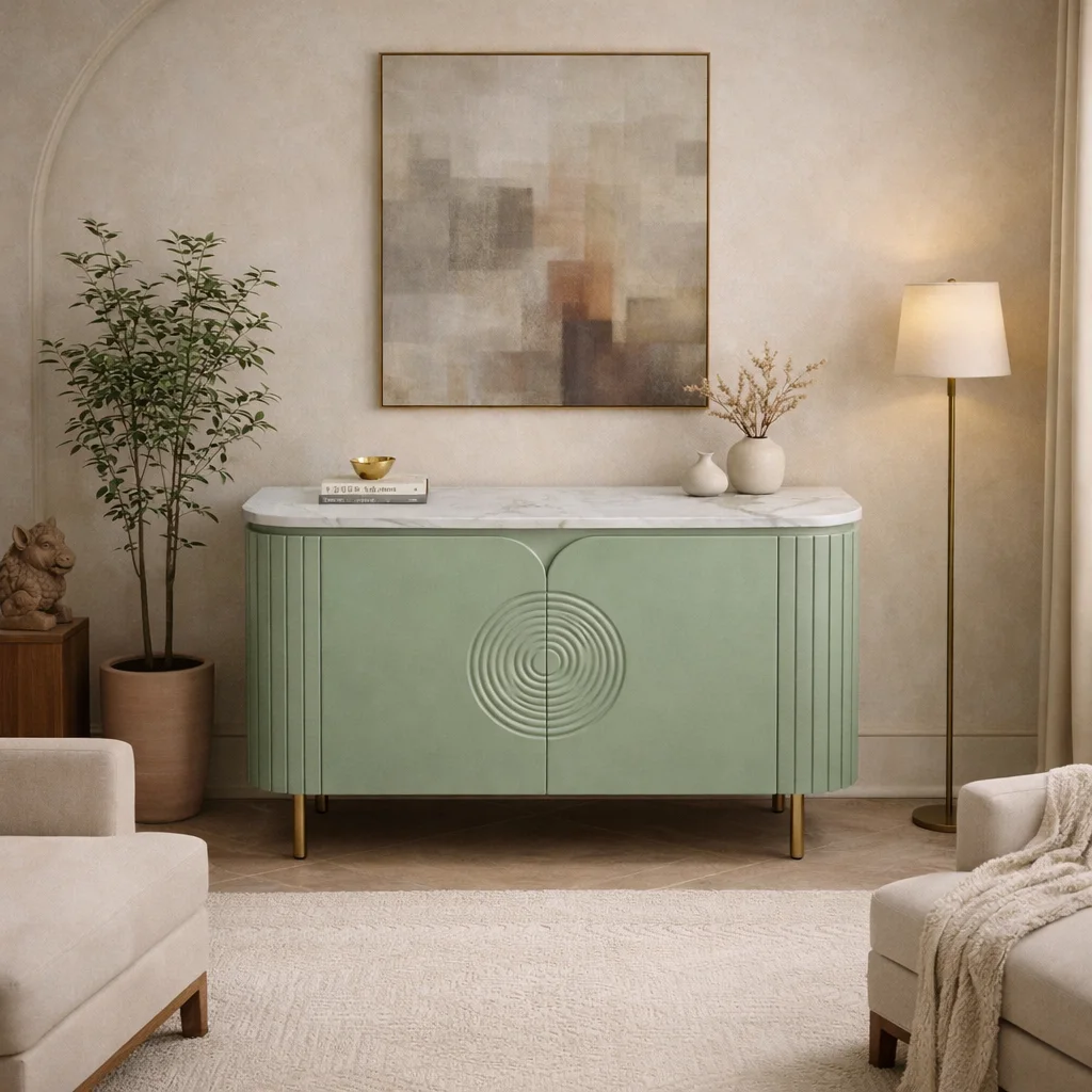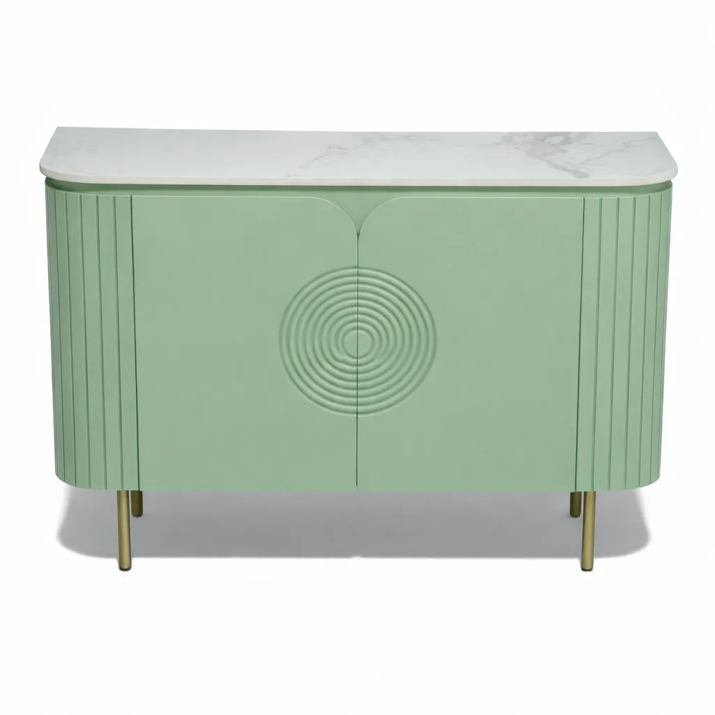 Crafted for modern luxury interiors, this Mandala Sideboard Cabinet features a durable sintered stone top inspired by Statuario marble, paired with a high-gloss premium acrylic finish in Sage Green. The elegant curved silhouette, fluted side panels, and signature circular door design create a statement look while offering spacious, organized storage. Sturdy gold-finish legs ensure stability with a refined, premium aesthetic perfect for living and dining spaces.