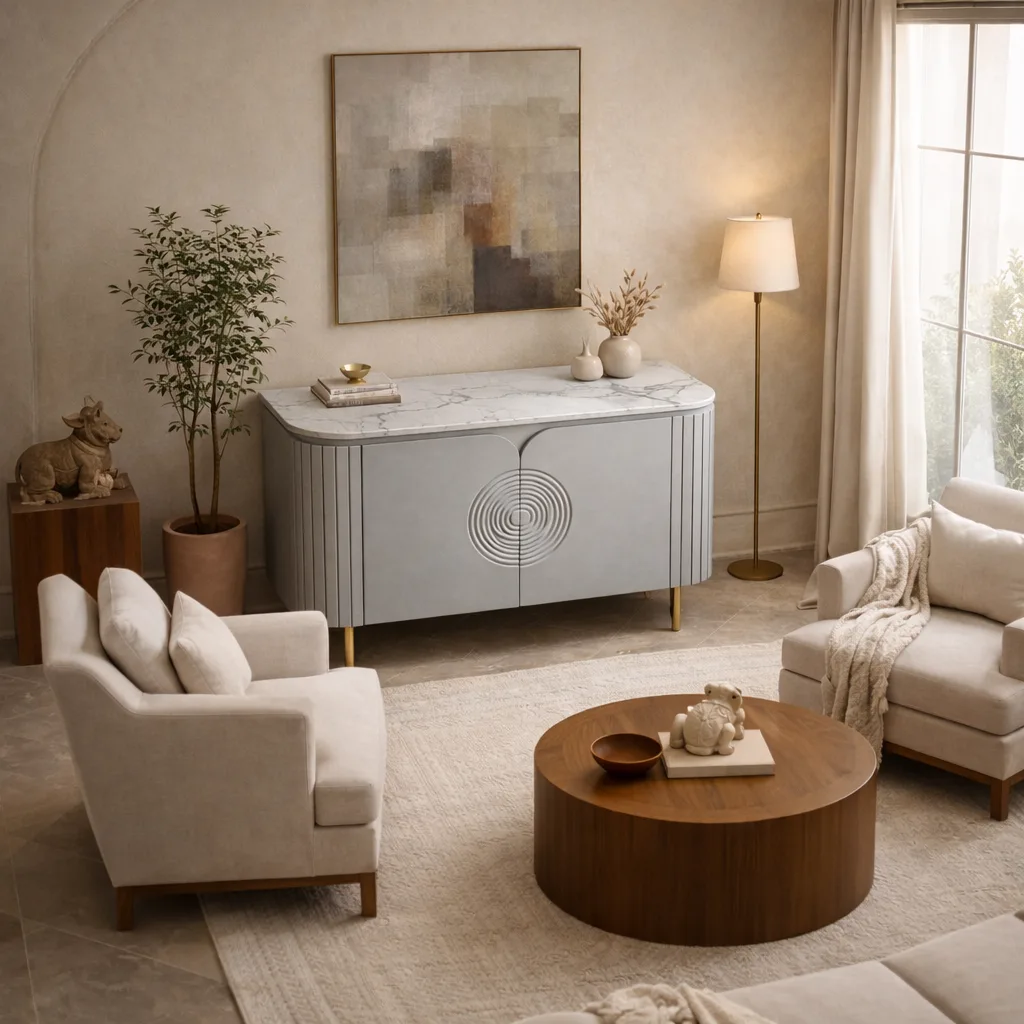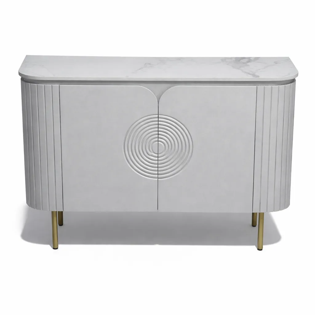 Crafted for modern luxury interiors, this Mandala Sideboard Cabinet features a durable sintered stone top inspired by Statuario marble, paired with a high-gloss premium acrylic finish in Silver Grey. The elegant curved silhouette, fluted side panels, and signature circular door design create a statement look while offering spacious, organized storage. Sturdy gold-finish legs ensure stability with a refined, premium aesthetic perfect for living and dining spaces.