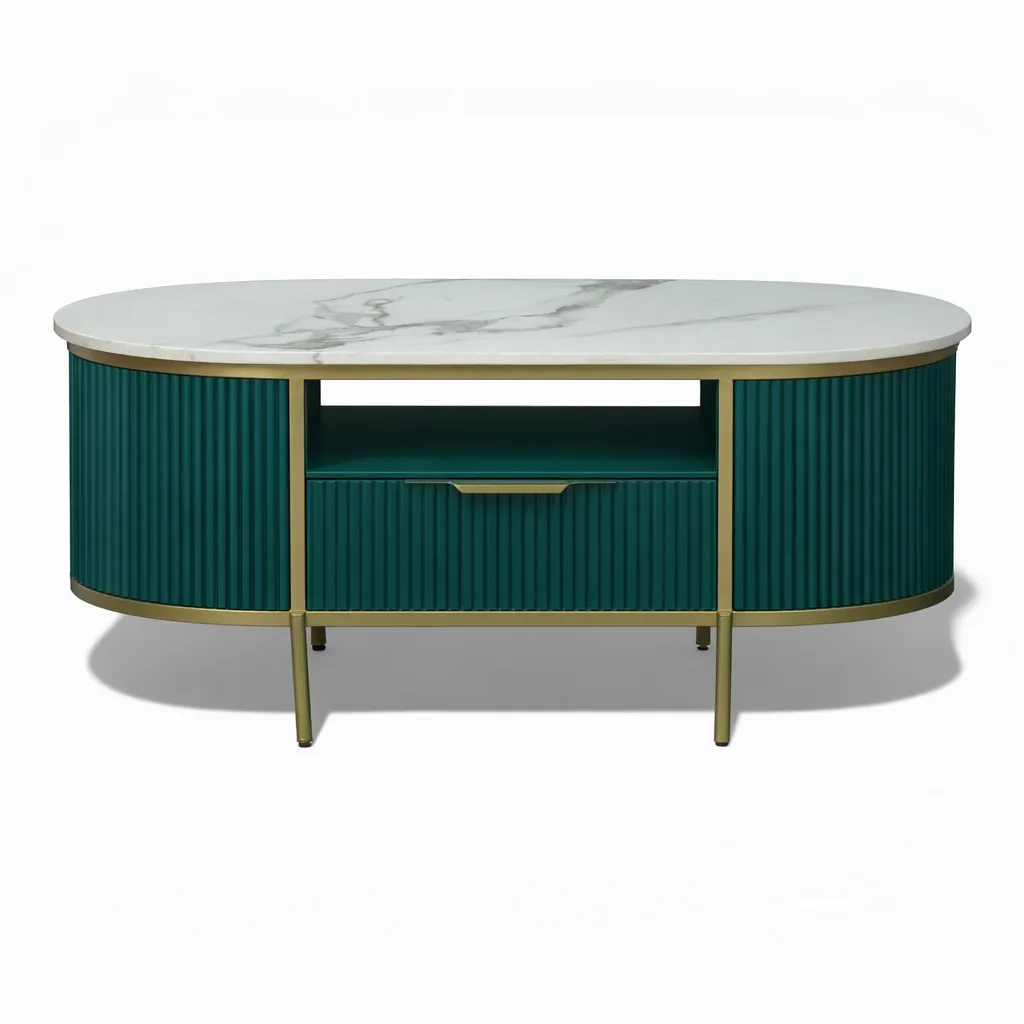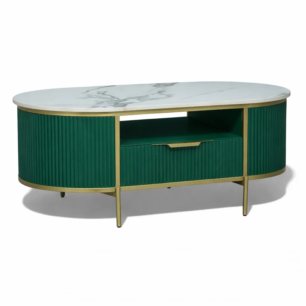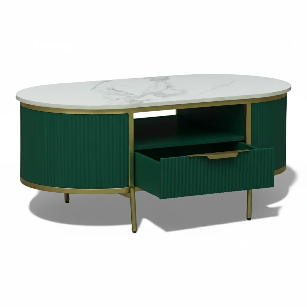 Elevate your living space with this elegant fluted coffee table designed to blend style and functionality. Featuring a premium sintered stone top, it offers a smooth, durable, and heat-resistant surface perfect for everyday use. The beautifully curved silhouette with fluted panel detailing adds a modern yet timeless aesthetic to your living room. A spacious drawer and open shelf provide convenient storage for books, remotes, and essentials, keeping your space organized. Supported by a sleek metal frame with a luxurious gold finish, this coffee table combines durability with sophisticated design, making it a perfect centerpiece for contemporary homes.