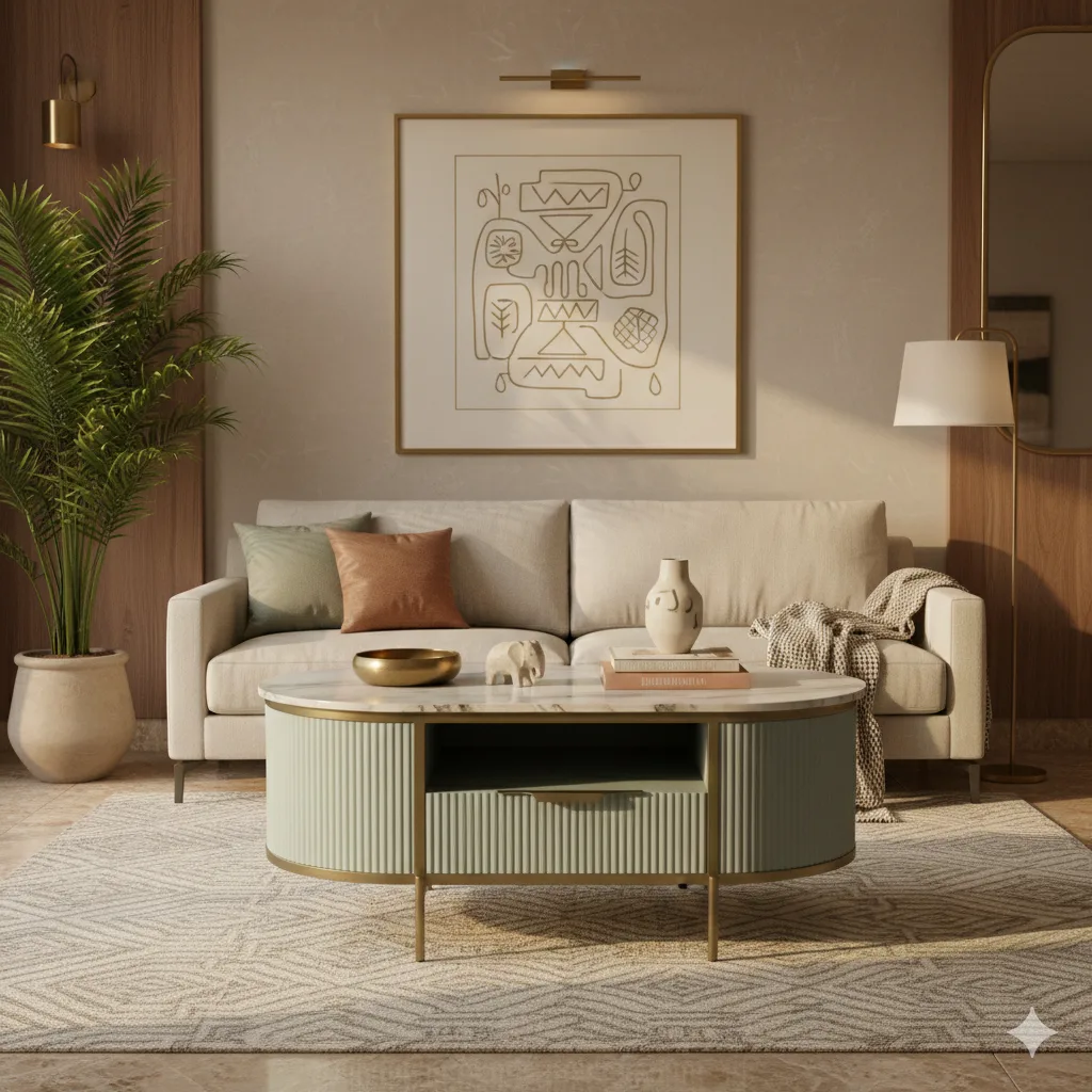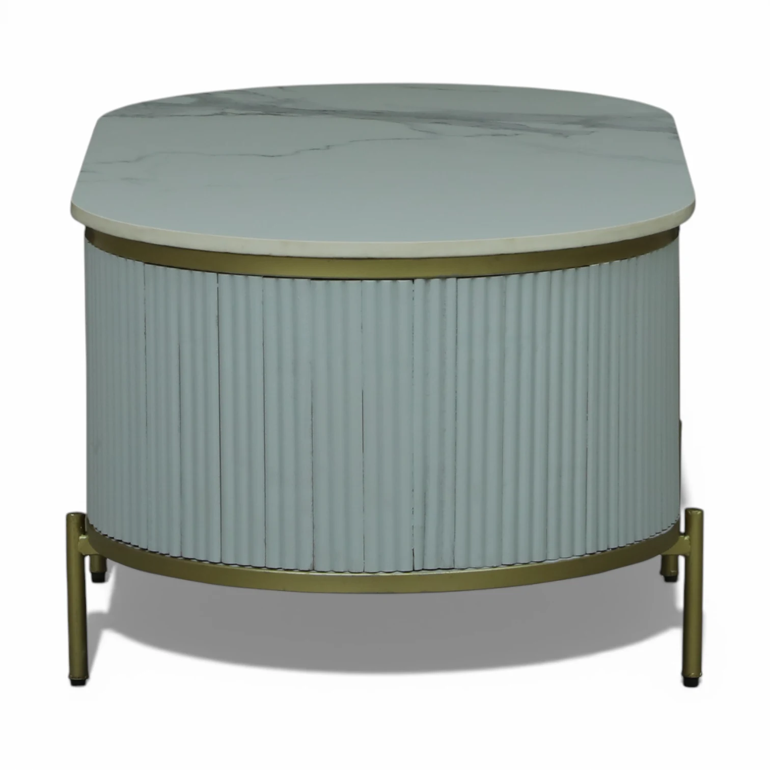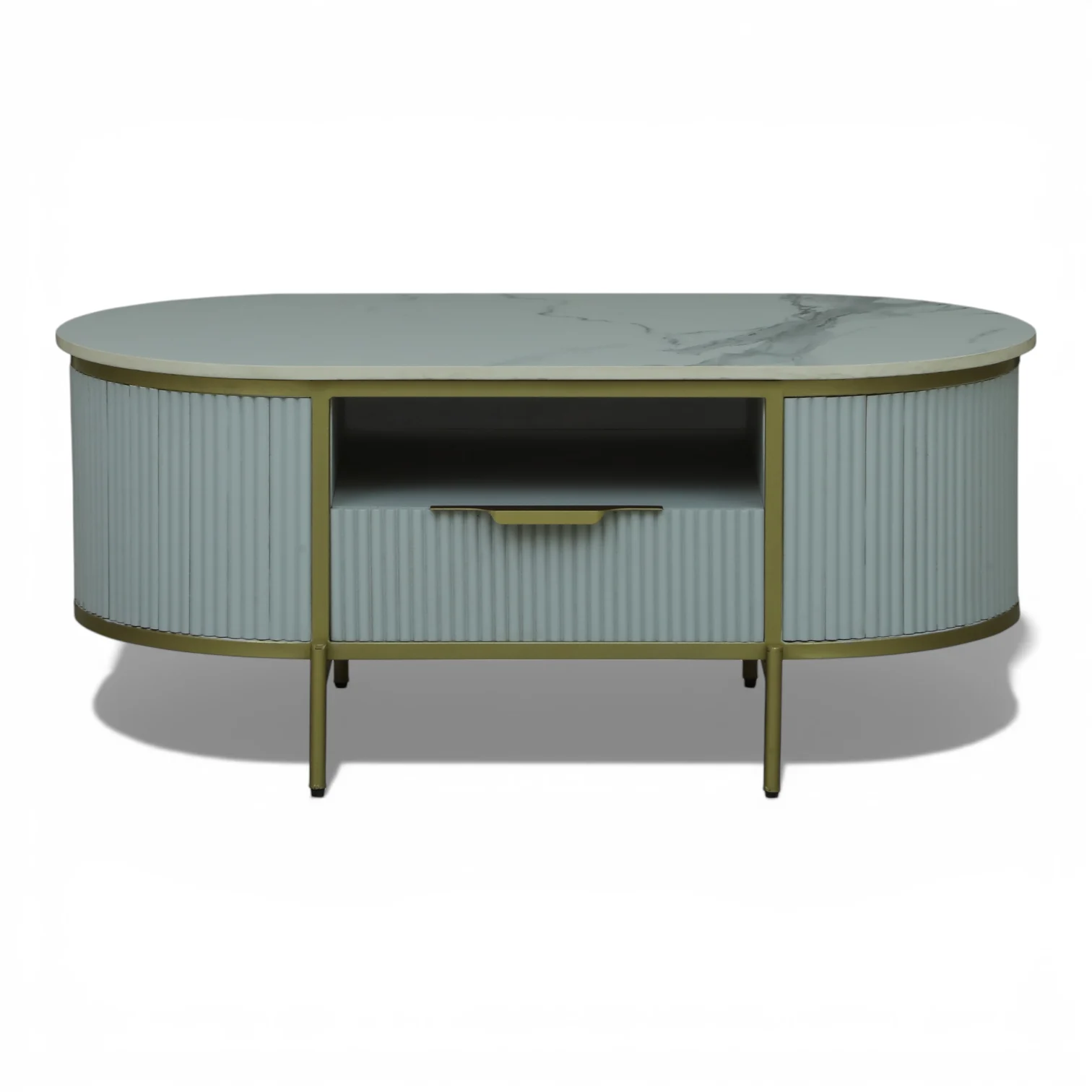 Elevate your living space with this elegant fluted coffee table designed to blend style and functionality. Featuring a premium sintered stone top, it offers a smooth, durable, and heat-resistant surface perfect for everyday use. The beautifully curved silhouette with fluted panel detailing adds a modern yet timeless aesthetic to your living room. A spacious drawer and open shelf provide convenient storage for books, remotes, and essentials, keeping your space organized. Supported by a sleek metal frame with a luxurious gold finish, this coffee table combines durability with sophisticated design, making it a perfect centerpiece for contemporary homes.