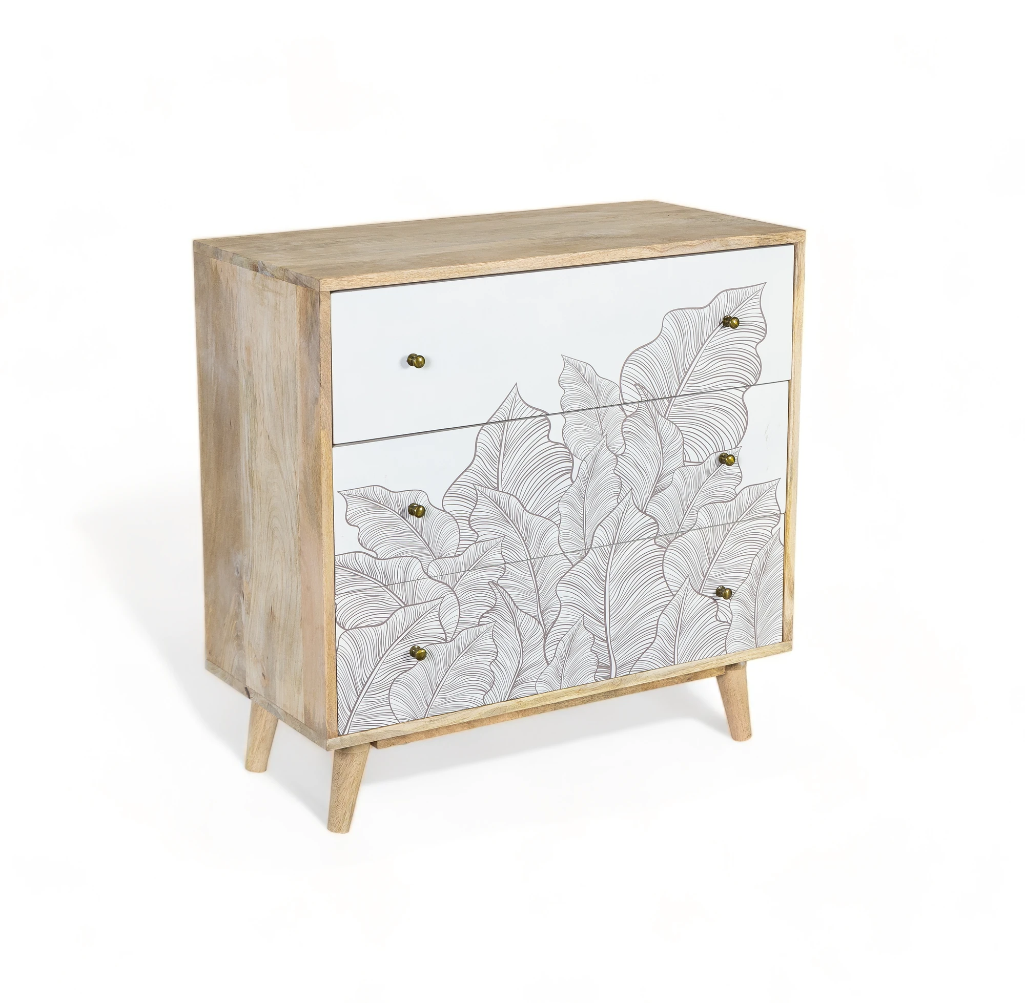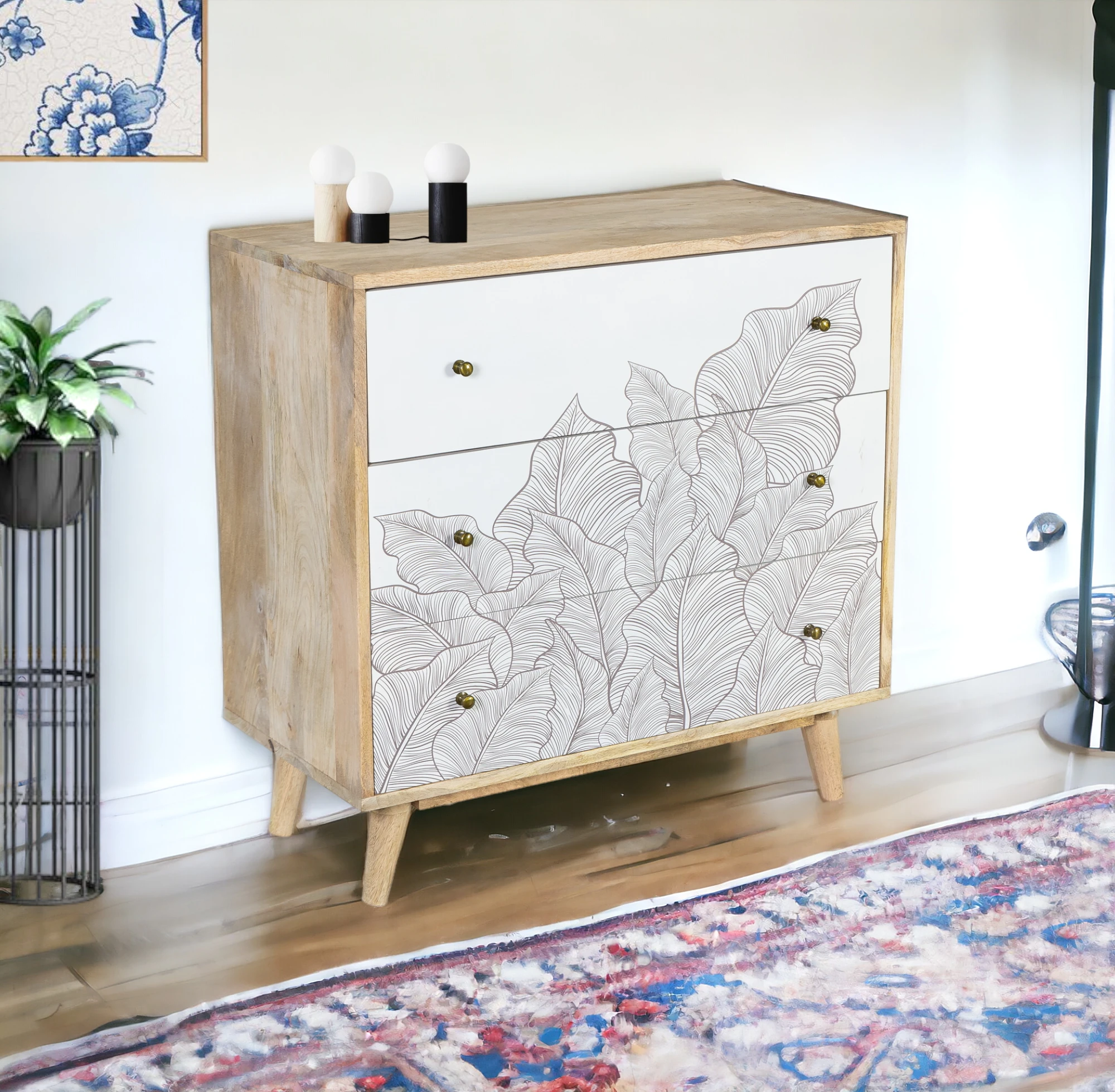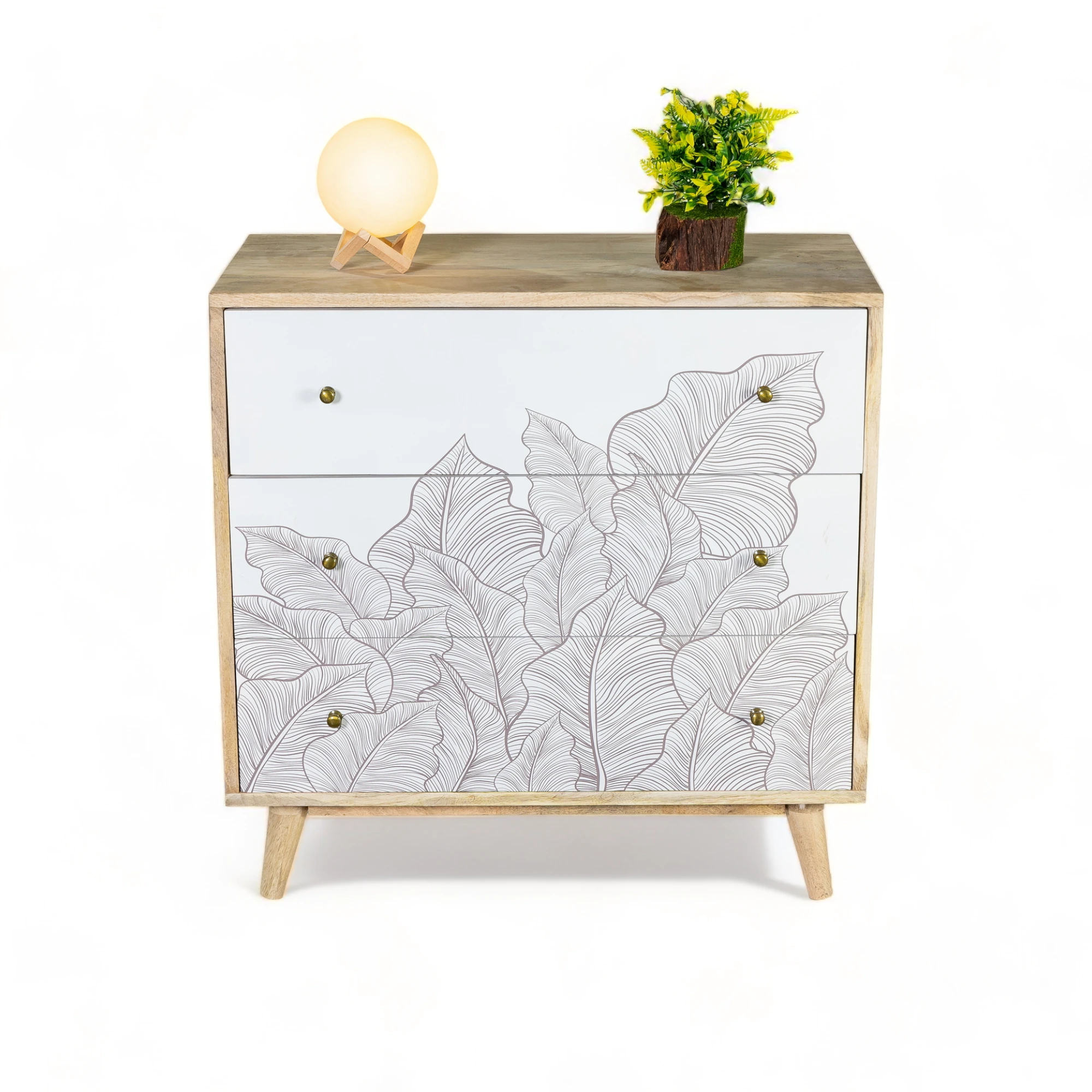 With three spacious drawers, the Ranthambore Chest of Drawers offers a chic and versatile storage solution for your daily essentials. The delicate leaf motif on the pristine white drawers transports you to the heart of nature, evoking a sense of calm and serenity.