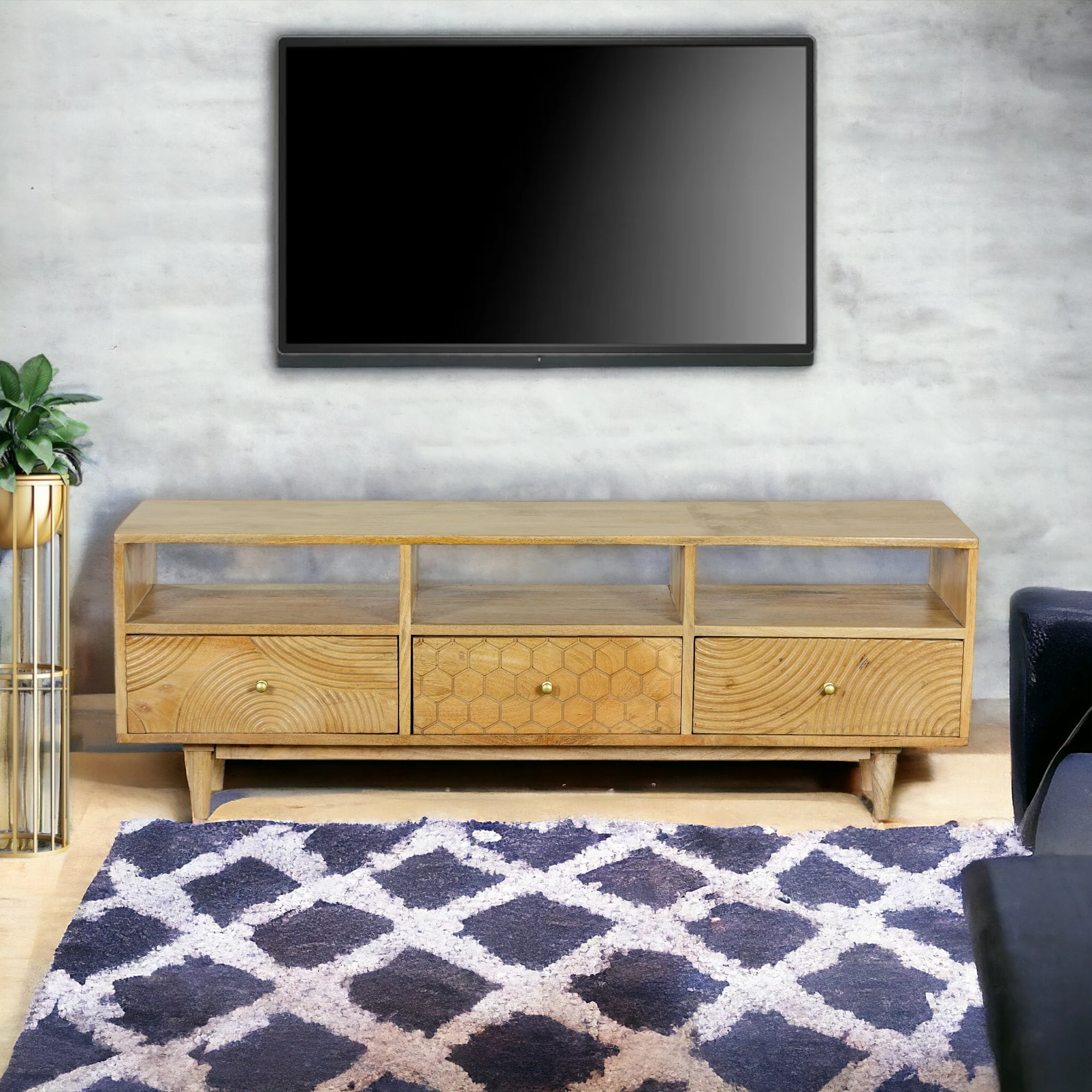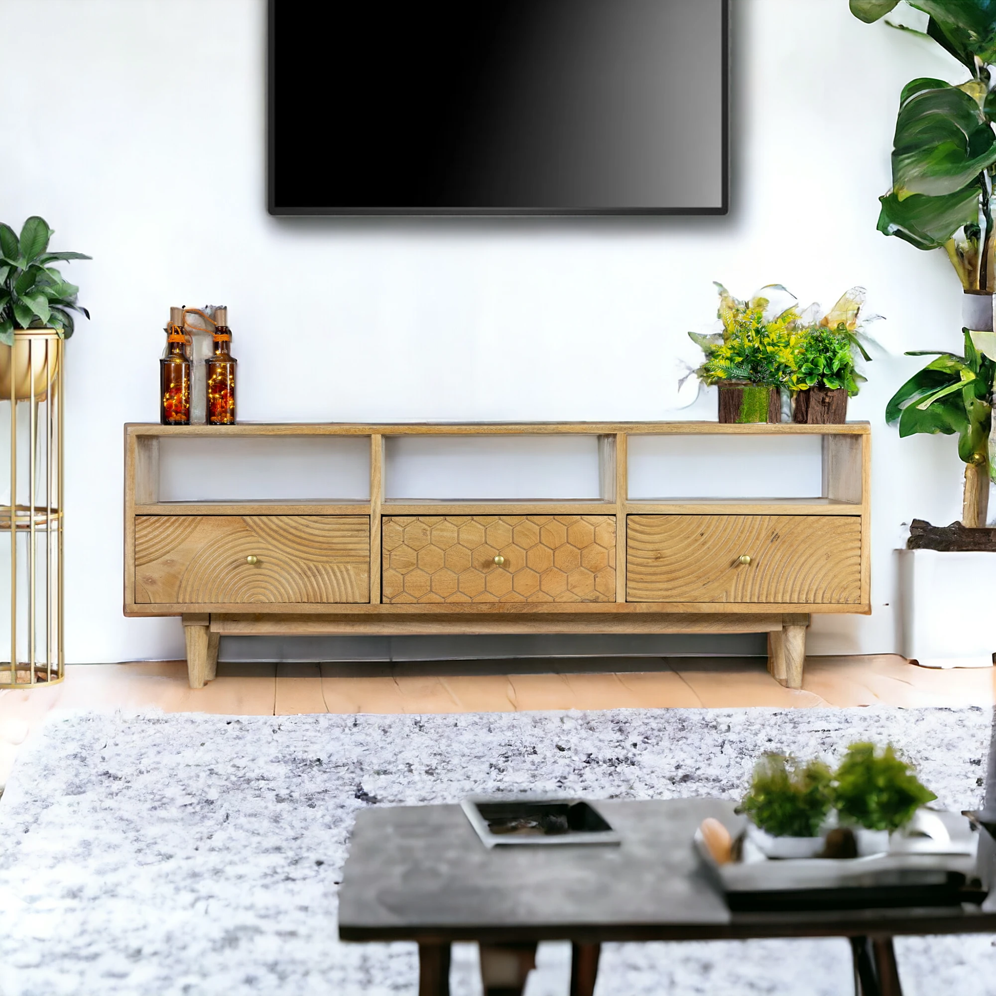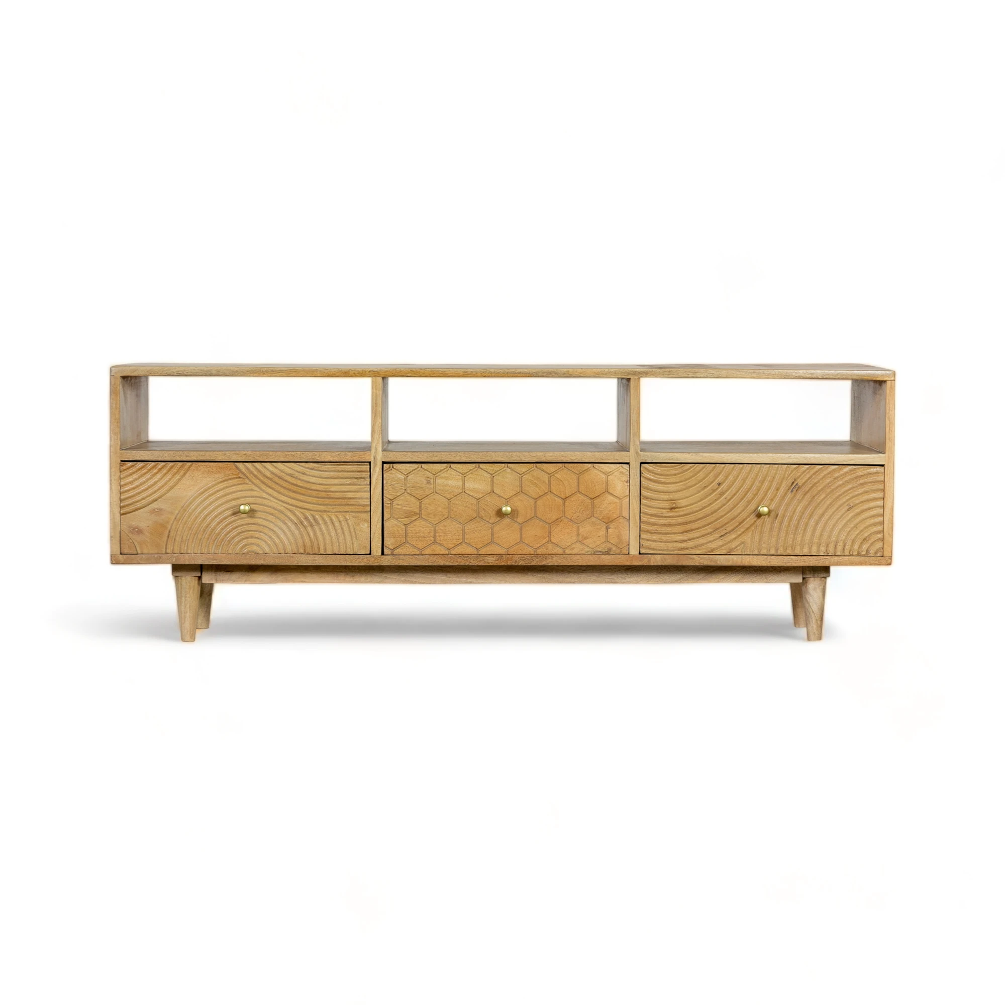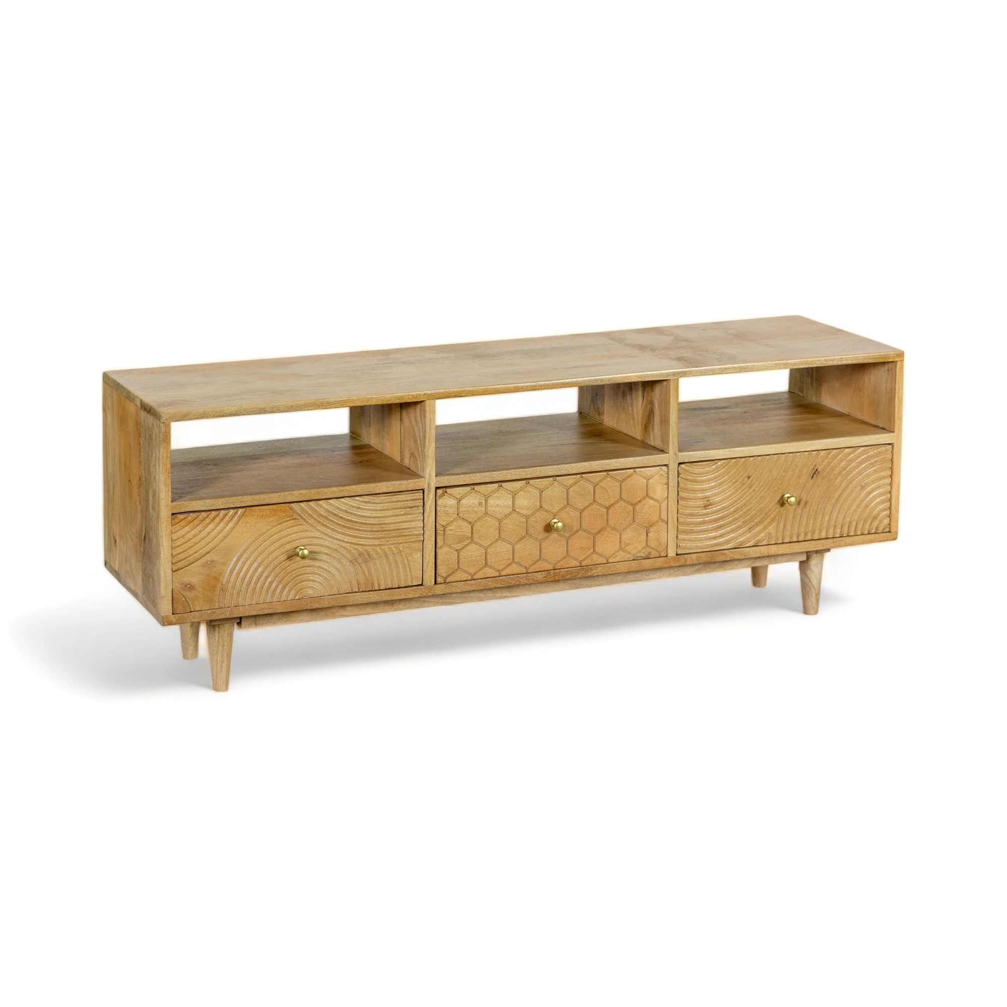 Featuring three spacious drawers adorned with intricate carvings, it’s not just storage; it’s a masterpiece. The detailed designs give a contemporary twist to the classic charm of mango wood, turning your TV setup into a gallery of style.