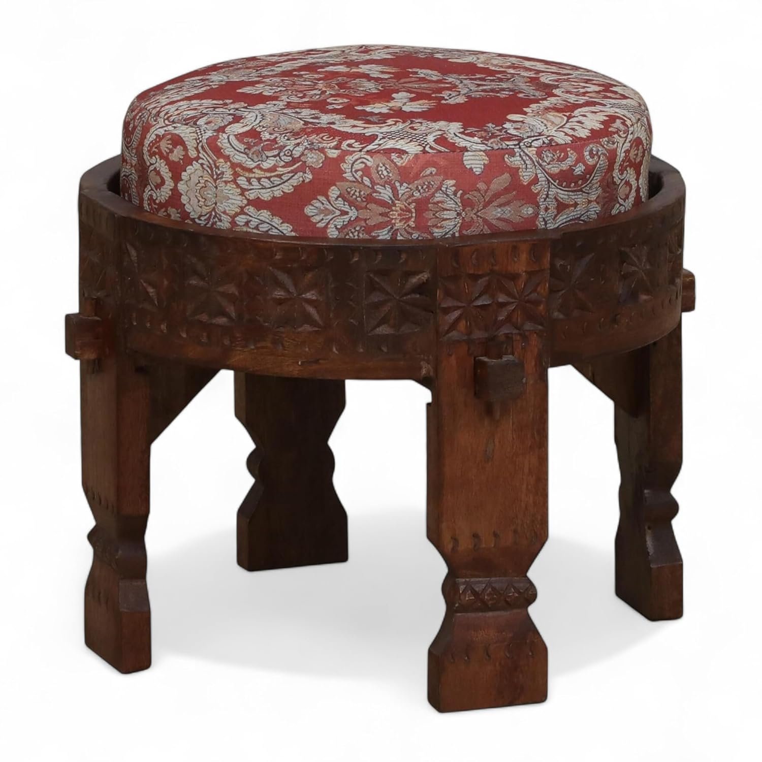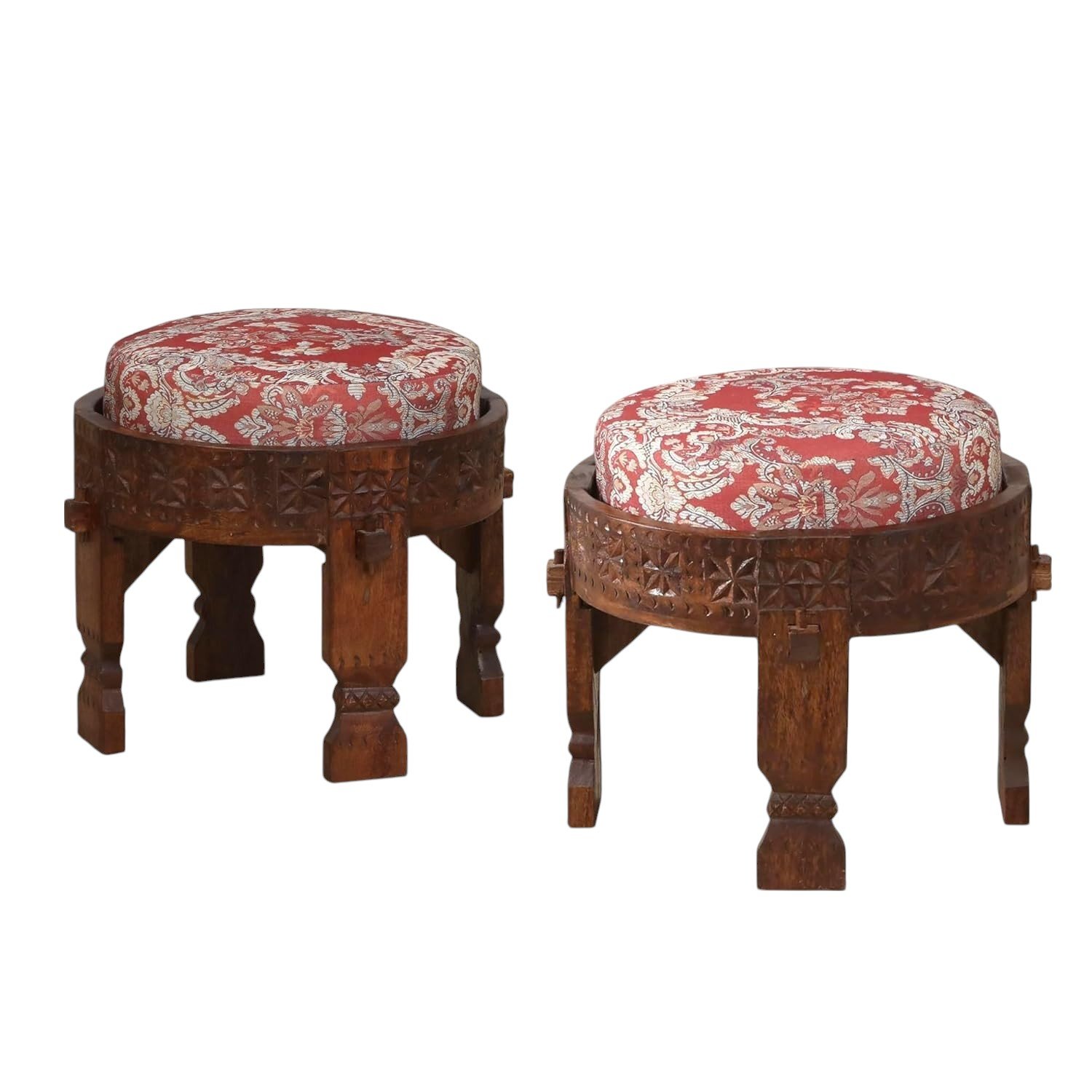 Kraft Bazaar Solid Wood Udaipur Low Seating Stool – Set of 2 (Size L, Tubaq Finish) Enhance your living space with this exquisite set of 2 hand-carved solid wood ottomans. Featuring a traditional Udaipur design, each stool comes with a plush 4-inch cushion for comfortable low seating. Finished in a rich Tubaq polish, these stools blend timeless craftsmanship with modern functionality—perfect for living rooms, lounges, or cozy corners.