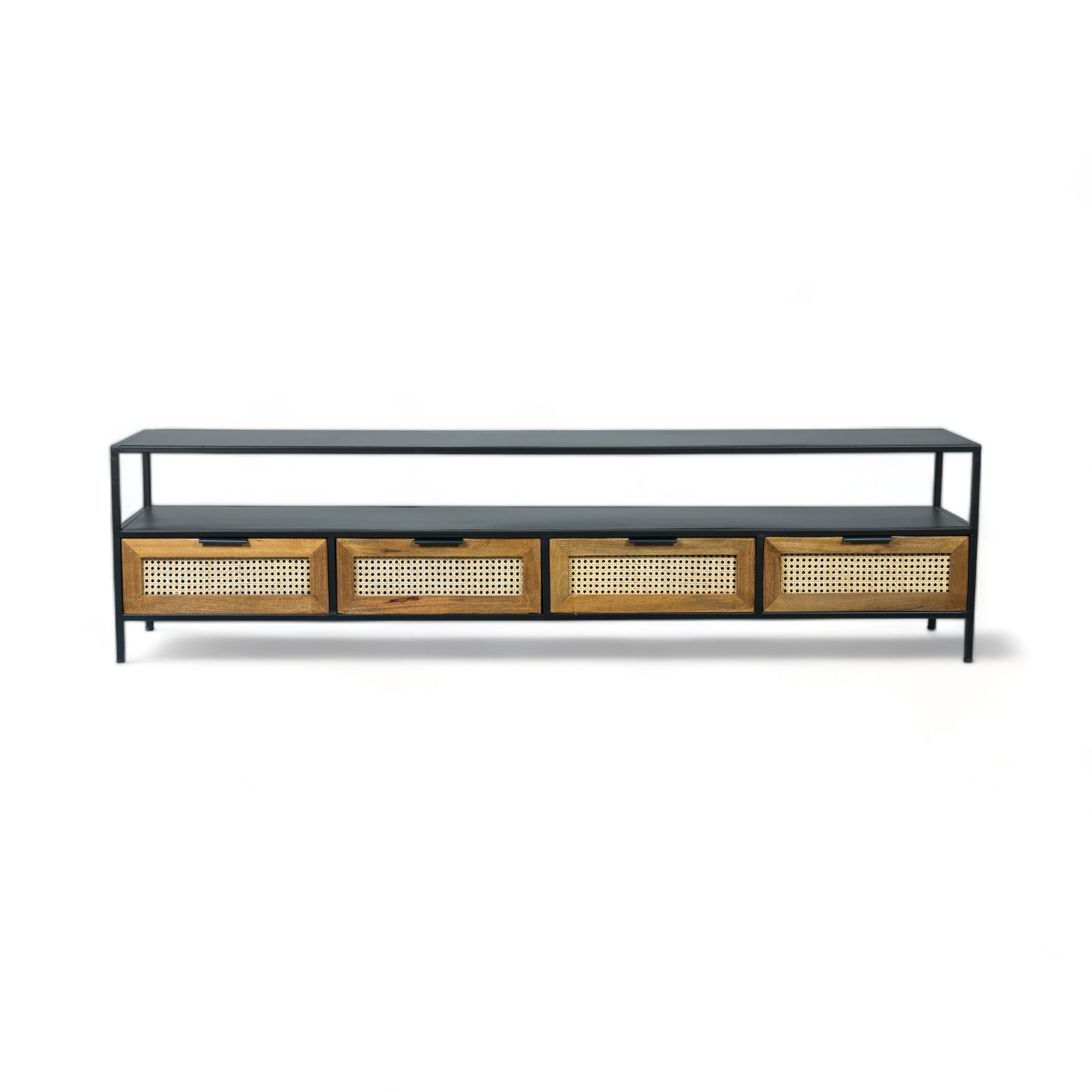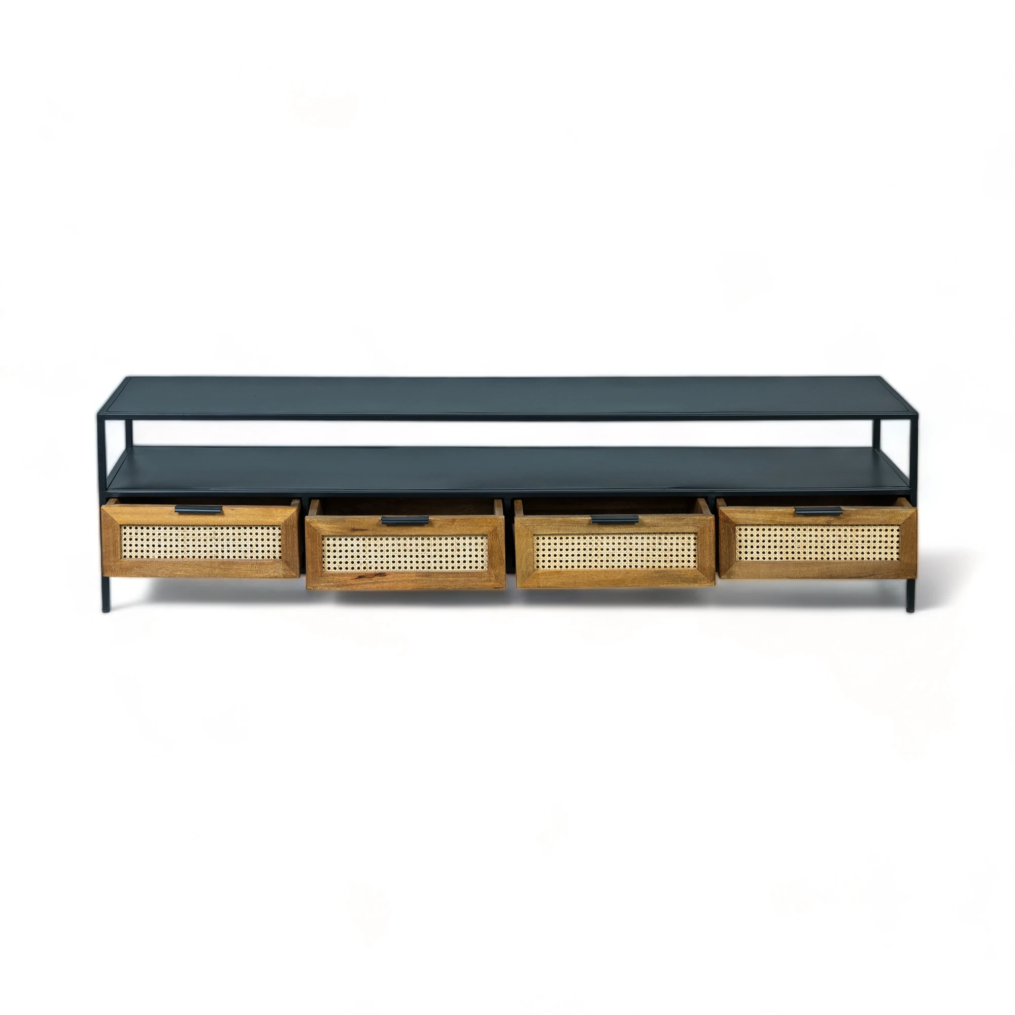 The perfect place to sit your television and trinkets, the Webber TV Unit is a functional and easy on the eye piece that will not disappoint. It also includes Four drawers with cane work which makes the Webber TV stand a timeless addition to your living space . These drawers with cane work and the brown stain finish on Mango wood gives the TV cabinet a magnificent look and a sight that is both industrial and sophisticated. There is a shelf in the centre of TV cabinet allowing ample of space for your D2H, Playstation, Soundsystem etc. Use the large surface area for the audio visual equipment and hide the games, DVDs, CDs, cables and leads in the combination of open and closed storage. The intricately detailed metal finish is perfect for industrial living schemes as well as ultra-modern and more classic décors